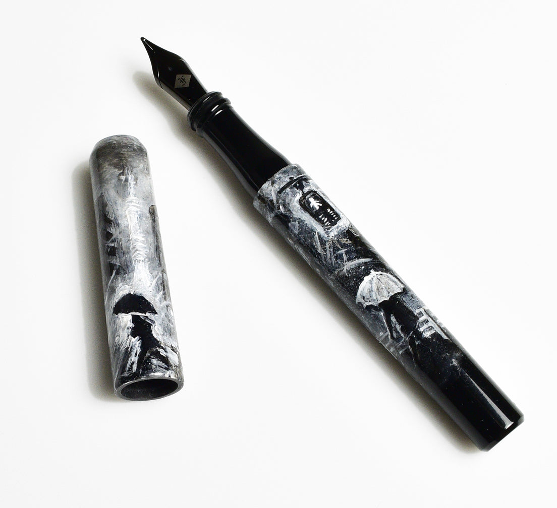 Prominently featured on the cover of the December 2024 Pen World, this is a one of a kind piece by artist A.A. Vacharat featuring a gothic city rain scenes. Umbrellas, rain, buildings, streets in a mystique of action mark this piece. This one sold immediately online in Jan, 2025 for $775, with gold nib.