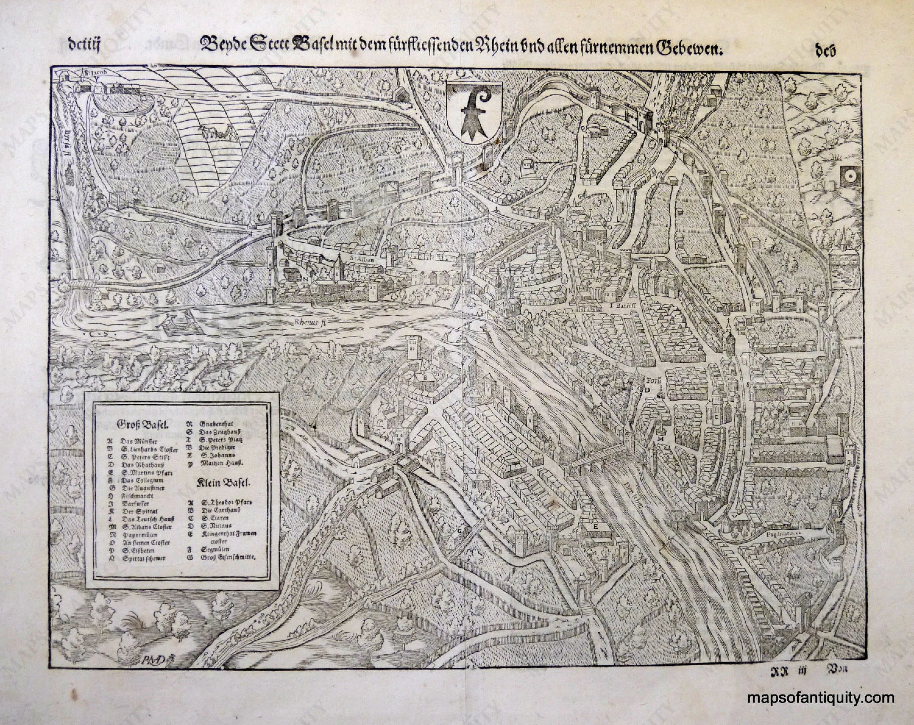 Black and White Antique Bird’s Eye View of Basel, Switzerland, bisected by the Rhine and showing the buildings of the town, main streets, farms, field and forest; with legend. From 16th century master cartographer Sebastian Munster, good condition with two small light brown spots, approx. 10 x 14 inches. **SOLD**