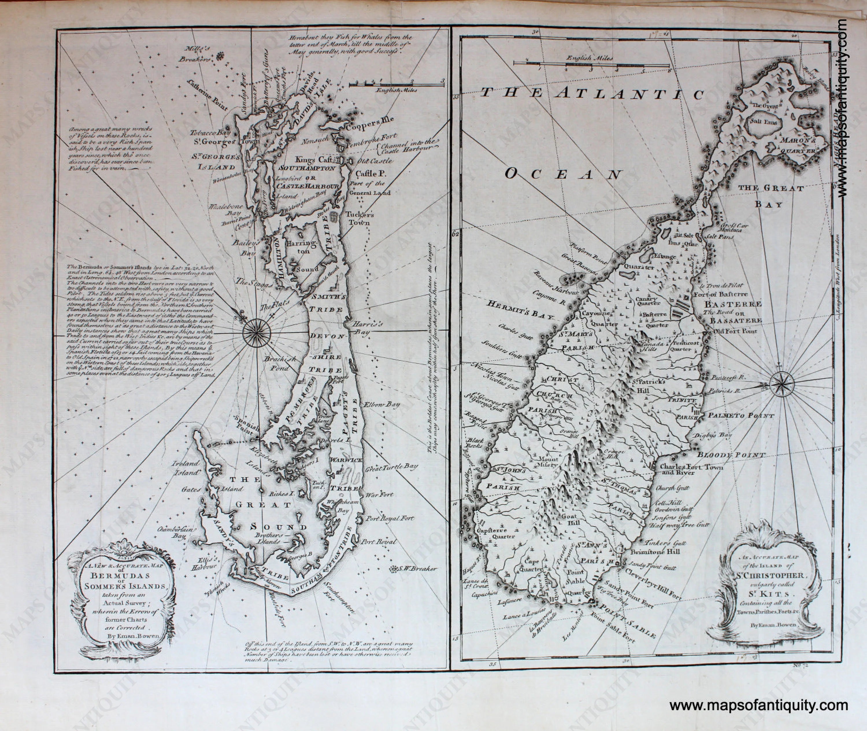 Antique black and white map in two sections showing Bermuda and St Kitts (Saint Kitts). By E. Bowen, c. 1747. Includes additional information about Bermuda in text around the map. With two decorative cartouches. This map is in very good antique condition, with some fold lines visible, has been restored and rebacked. approx. 14 x 17 inches to neatline. **NOTE- because this map requires extra insurance for shipping, an additional charge will appear on your card after your original purchase. If you would like to know what that charge will be, please contact us.**