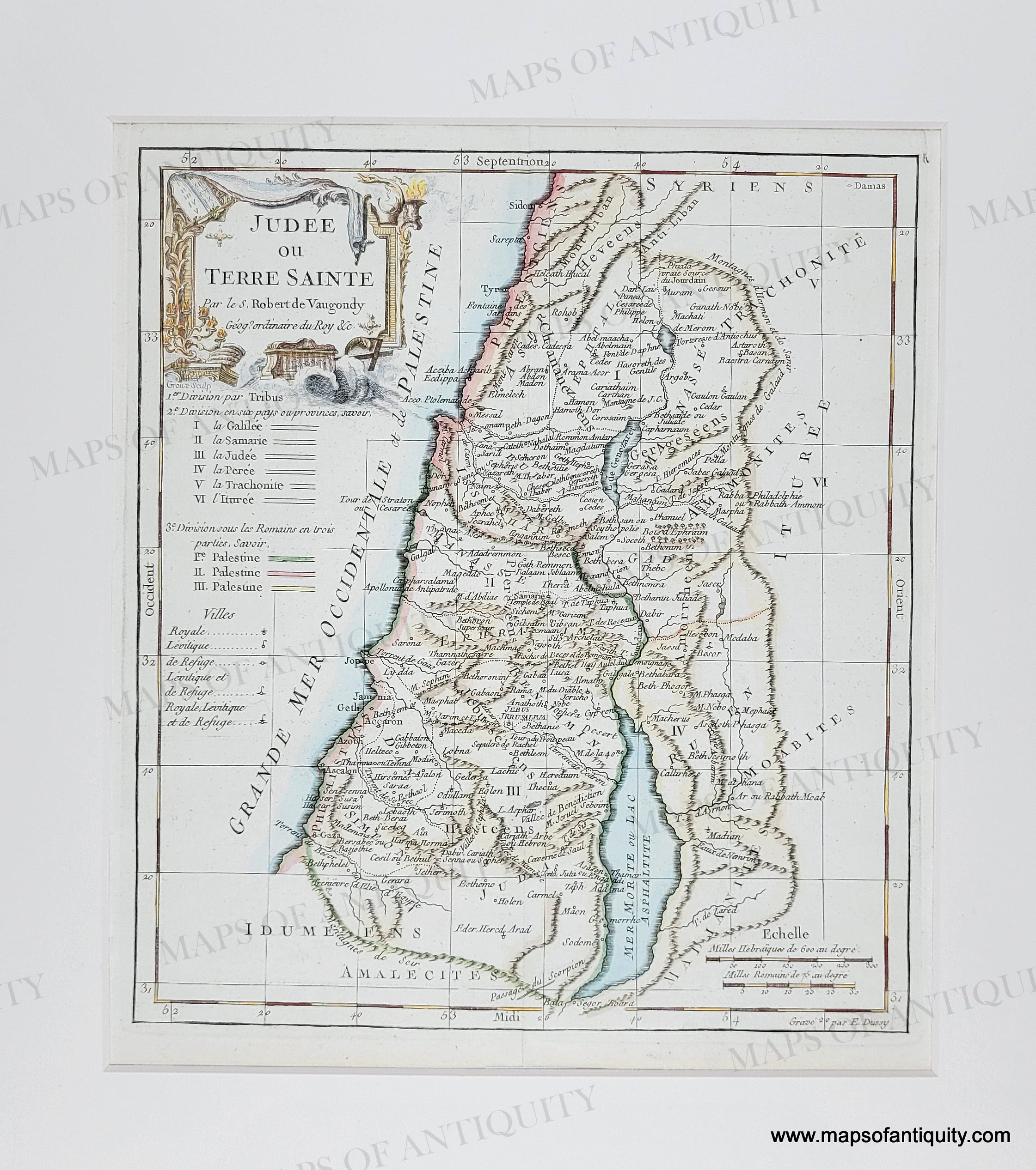 Antique Map of Judea or Holy Land by Sir Robert de Vaugondy, 1790s. Very good antique condition. Some of the coloring is likely recent. Matted. Measures approx. 9.75 x 8.25 inches to the neatline.