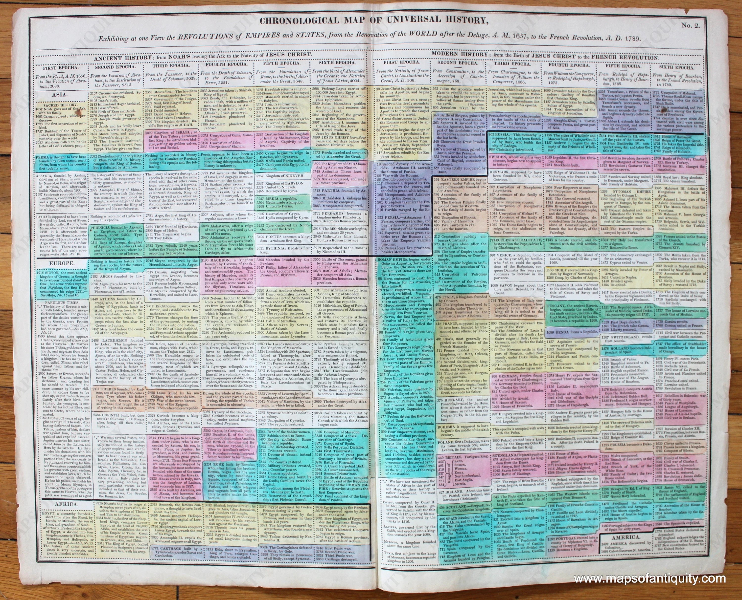 Antique hand colored historical diagram “Exhibiting at one View the Revolutions of Empires and States, from the Renovation of the World after the Deluge, A. M. 1657, to the French Revolution, A. D. 1789,” drawn from the most recent Authorities for the Illustration of Lavoisne’s Atlas, published by Carey & Sons, timeline and detailed descriptions reviewing the revolution of the empires and states from 1657 to 1789, colorful and interesting descriptions of world history by continent. Good to very good overall antique condition with toning throughout, areas of noticeable foxing, some creasing/wrinkling, very mild tears at the outer edges of the paper, and minor seam separation at the center of the map. Total sheet dimensions are about 16 1/2″h x 20″w.