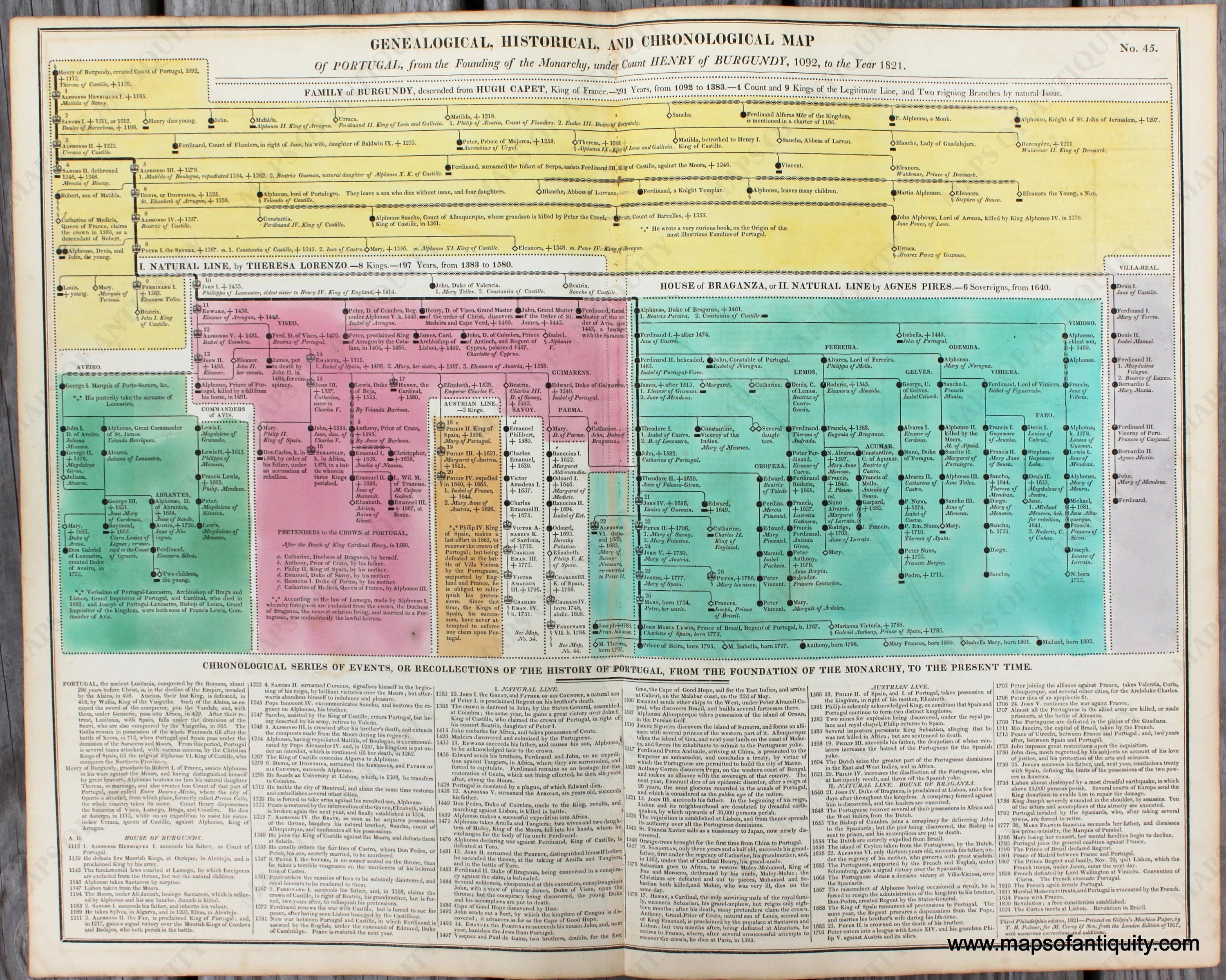 From A Complete Genealogical, Historical, Chronological, and Geographical Atlas; Being a General Guide to Ancient and Modern History: An Accurate Account of the Origin, Descent, and Marriages of the Principal Royal Families from the Earliest Authentic Records; Together with the Various Possessions, Wars, Celebrated Battles, and Remarkable Events, to the Year 1821″ by Lavoisne, published by Carey & Sons, hand colored antique timeline and genealogy including the Family of Burgundy, the I. Natural Line by Theresa Loranzo, and the House of Braganza, or II. Natural Line by Agnes Pires. Good condition with a few minor spots and some edge tears, total sheet dimensions are about 16 1/2″h x 20″w.