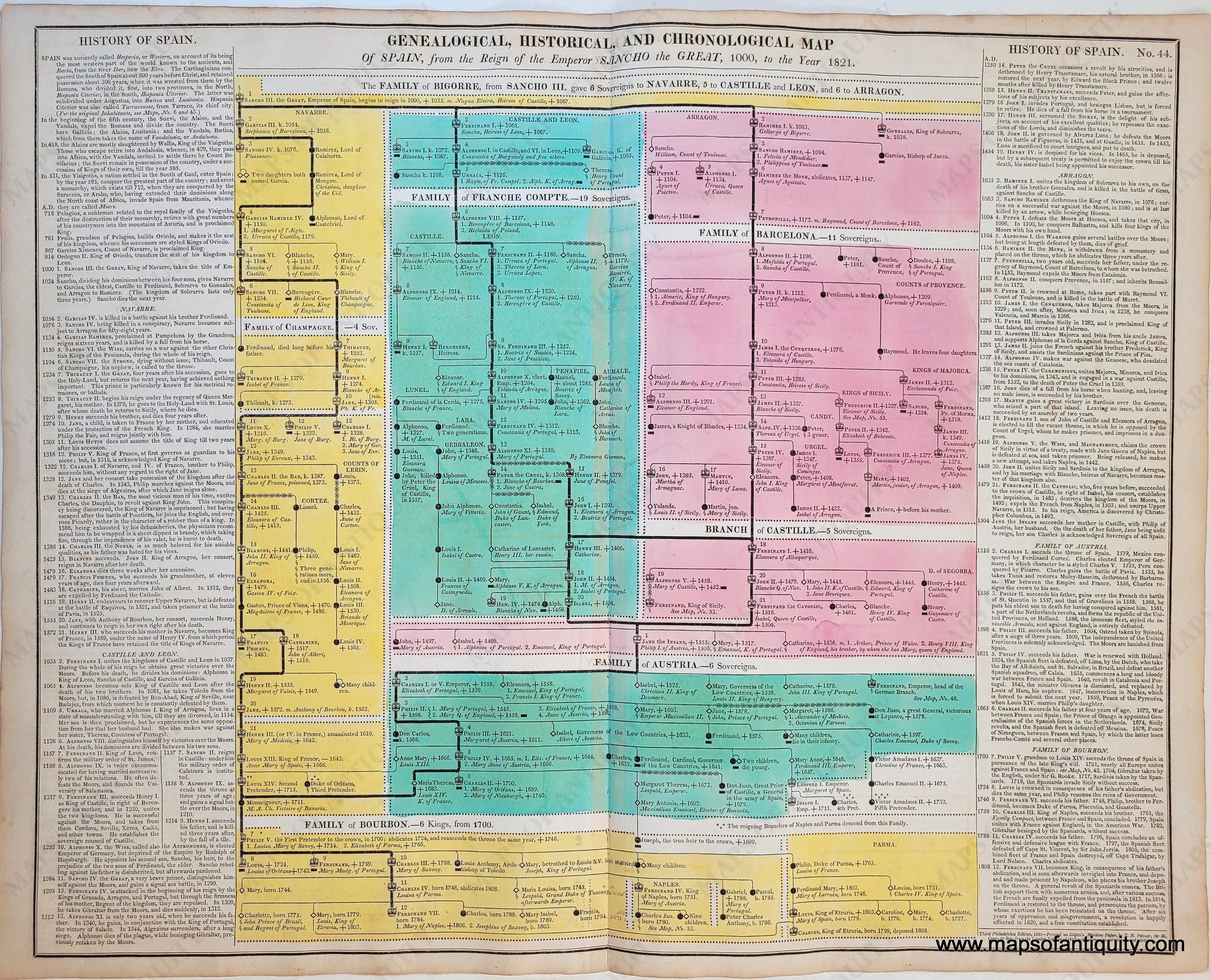 Antique hand colored diagram, from A Complete Genealogical, Historical, Chronological, and Geographical Atlas; Being a General Guide to Ancient and Modern History: An Accurate Account of the Origin, Descent, and Marriages of the Principal Royal Families from the Earliest Authentic Records; Together with the Various Possessions, Wars, Celebrated Battles, and Remarkable Events, to the Year 1821″ by Lavoisne, published by Carey & Sons. Includes timeline and genealogy including the Families of Bigorre, Franche Compte, Barcelona, Castille, Austria, and Bourbon, with historical information. Very good overall antique condition with toning that is darker at the paper edges and along the center fold. Total sheet dimensions are about 16 1/2″h x 20″w.