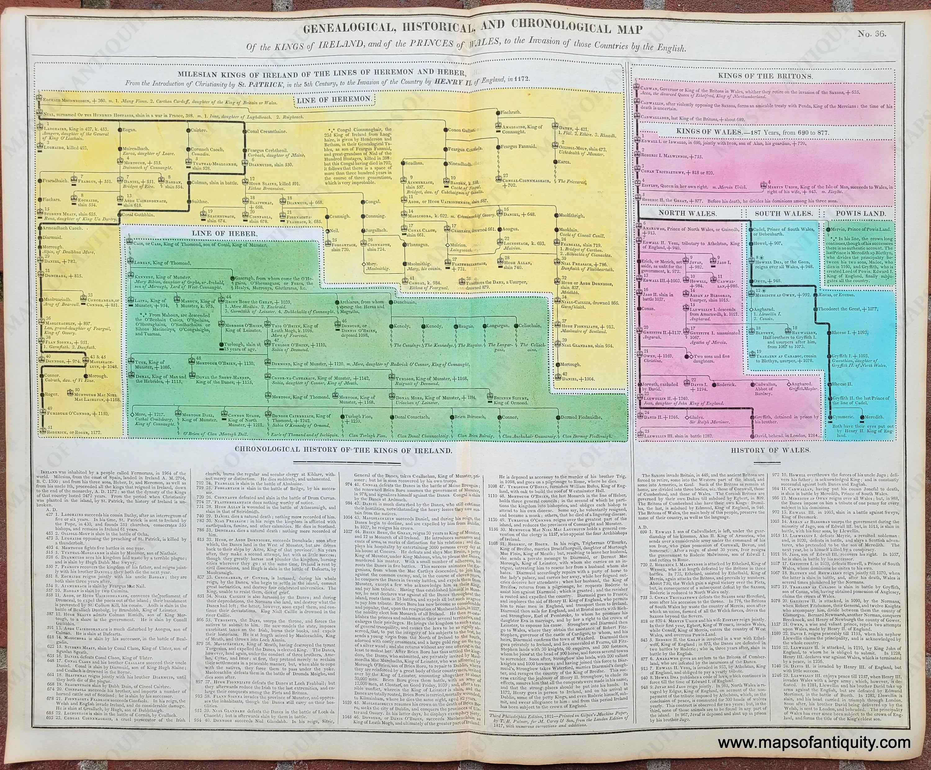 Antique hand colored chart from “A Complete Genealogical, Historical, Chronological, and Geographical Atlas; Being a General Guide to Ancient and Modern History: An Accurate Account of the Origin, Descent, and Marriages of the Principal Royal Families from the Earliest Authentic Records; Together with the Various Possessions, Wars, Celebrated Battles, and Remarkable Events, to the Year 1821” by Lavoisne, published by Carey & Sons. This is a timeline and genealogy including the genealogies of the Milesian Kings of Ireland, the Line of Heber, the Kings of the Britons, the Kings of Wales, with histories. Very good condition, some mild spots/stains, some darkening at the paper edges and along the center fold. Total sheet dimensions are about 17.5 x 21.5 inches.
