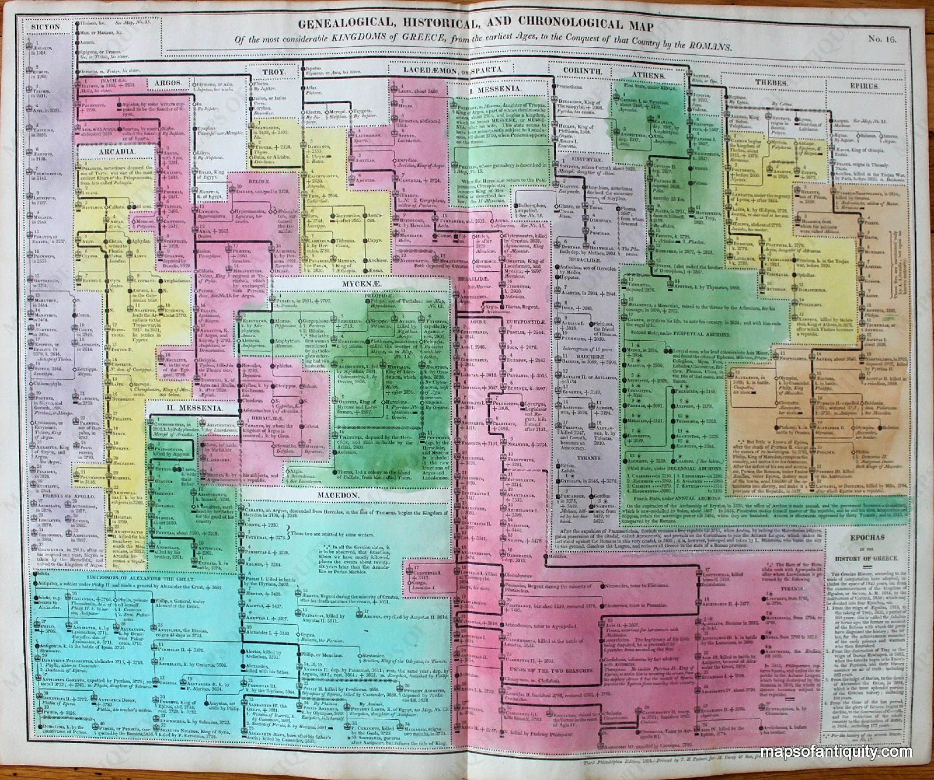 Very good overall antique condition, from the most recent Authorities for the Illustration of Lavoisne’s Atlas, published by Carey & Sons, description and timeline of the Kingdoms of Greece from the earliest ages to the Roman Conquest, total double sheet dimensions are about 16 1/2″h x 20″w.