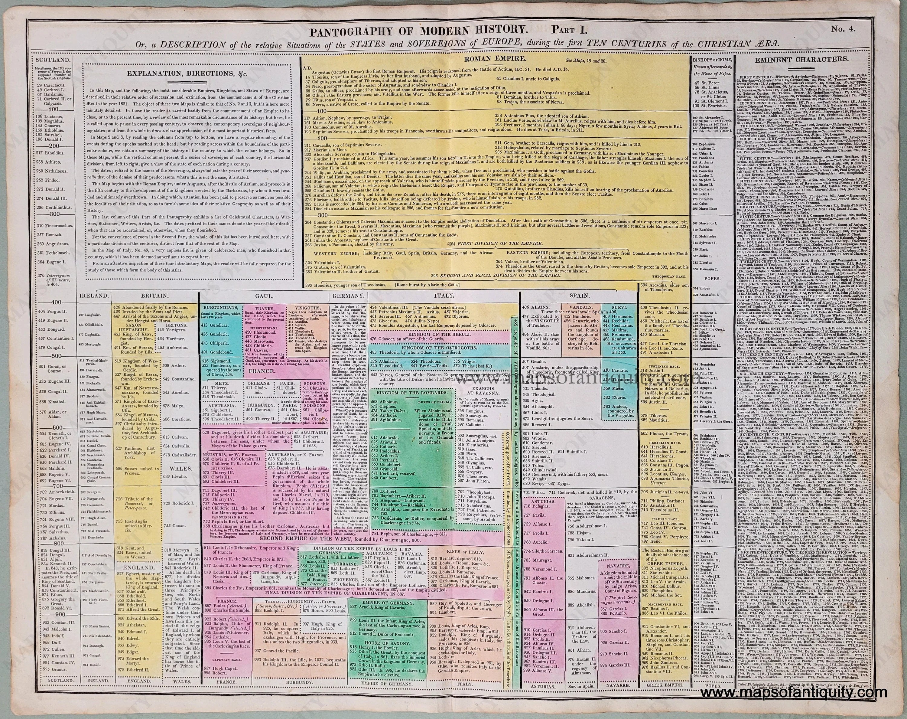 Antique historical chart with descriptions and timeline of Europe during the first ten centuries of the Christian Era. Very good overall antique condition, from the most recent Authorities for the Illustration of Lavoisne’s Atlas, published by Carey & Sons, total sheet dimensions are about 16 1/2″h x 20″w.