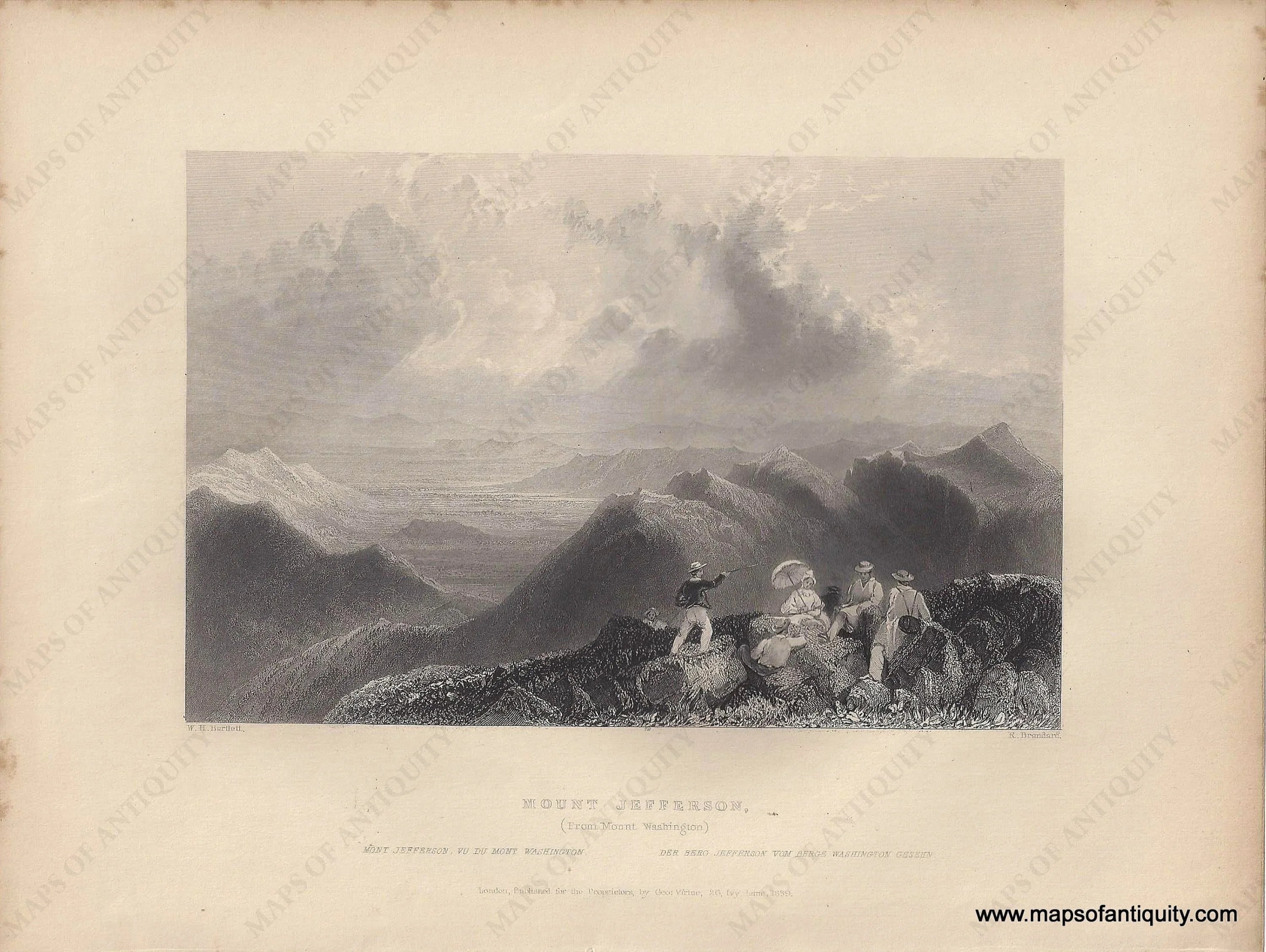 Antique print showing a scene of figures sitting atop Mount Washington in New Hampshire, with a scenic view of Mount Jefferson. Published in American Scenery Volume 2, by George Virtue, 1839. Good to Very good overall antique condition with mild toning of the paper and foxing/soiling along the edges of the paper. Page measures approximately 8.5″ x 10.75″ overall. Note: any “rainbows” or strange patterns in the image are called moire pattern- caused by taking a digital photo or scan of the many parallel lines in the print- these are not in the print and we can try to take more photos if you are concerned.