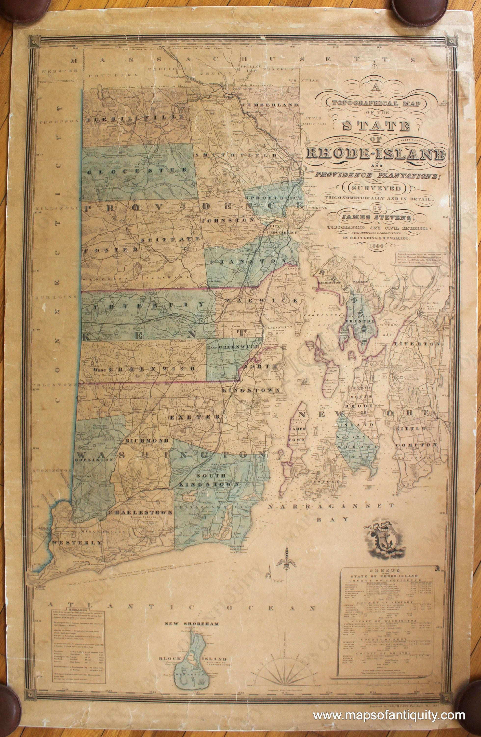 Antique hand colored wall map of Rhode Island published by Isaac H. Cady in 1846. Colored by town with villages, cities, railroads, and trees throughout. Includes Narragansett, Block Island, Newport, Westerly, and more. Surveyed by James Stevens, with additions and corrections by S.B. Cushing and H.F. Walling. The text at lower left discusses various things including time, tides, locations etc. At lower right are the results of the censuses from 1820, 1830, and 1840. Good condition. Restored: cleaned, deacidified, backed with heavy archival paper. Many cracks and tears are still visible, although they are all repaired, and give this map a beautiful antique appearance. Approx. 41.5 x 26.57 inches to the neatline. Overall sheet dimensions are 44.75 x 29 inches. **NOTE- because this map requires extra insurance for shipping, an additional charge will appear on your card after your original purchase. If you would like to know what that charge will be, please contact us.** **SOLD**