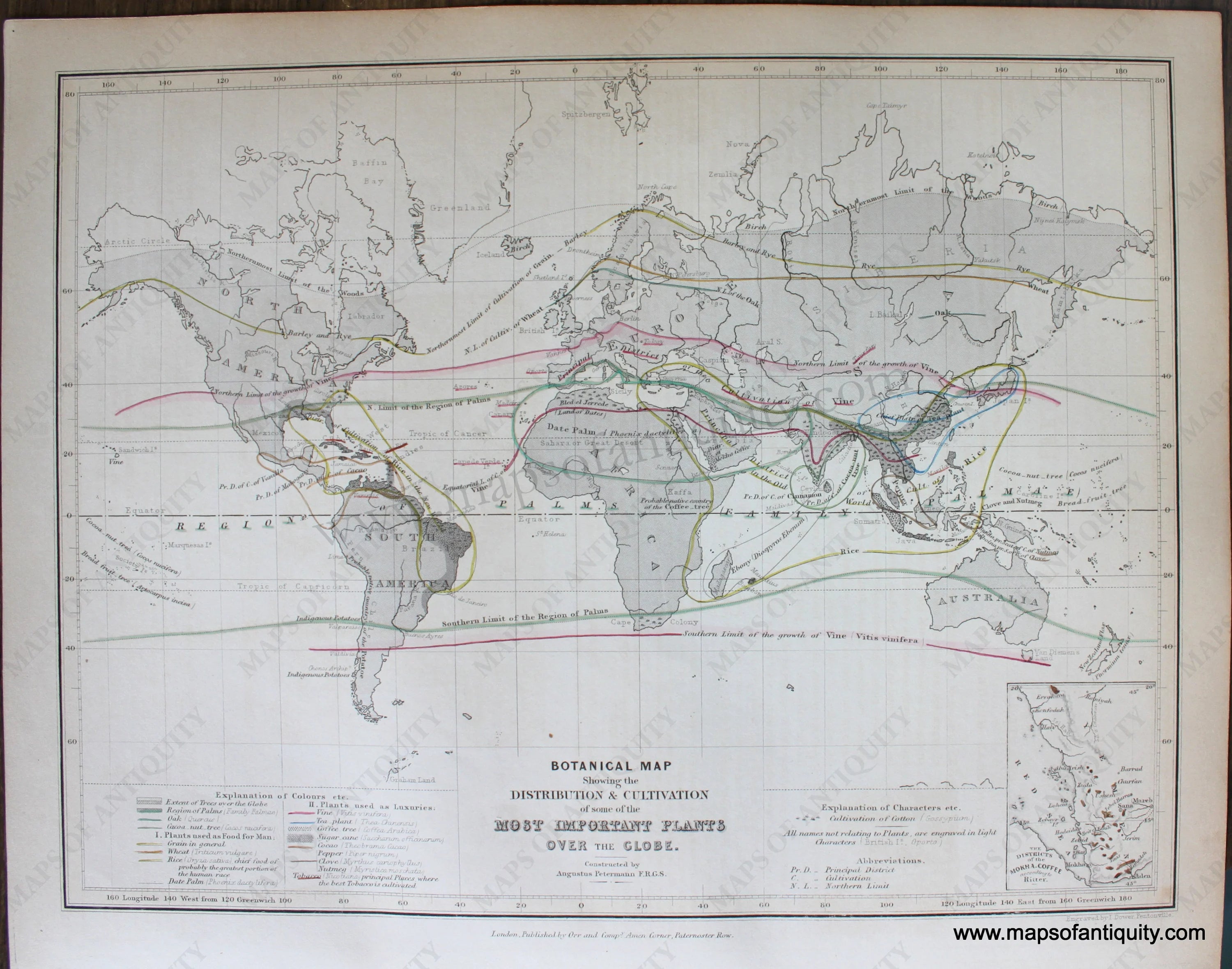 Antique hand colored map of the world showing plant distribution. Engraved by J Dower. From A Descriptive Atlas of Astronomy and of Physical and Political Geography by the Rev. Thomas Milner, maps by Augustus Petermann, and published by William S. Orr & Co, 1850. Very good condition with some minor signs of age, such as spots, toning, and mild image transfer. Tight margin. Page measures approx. 9.25 x 12 inches.