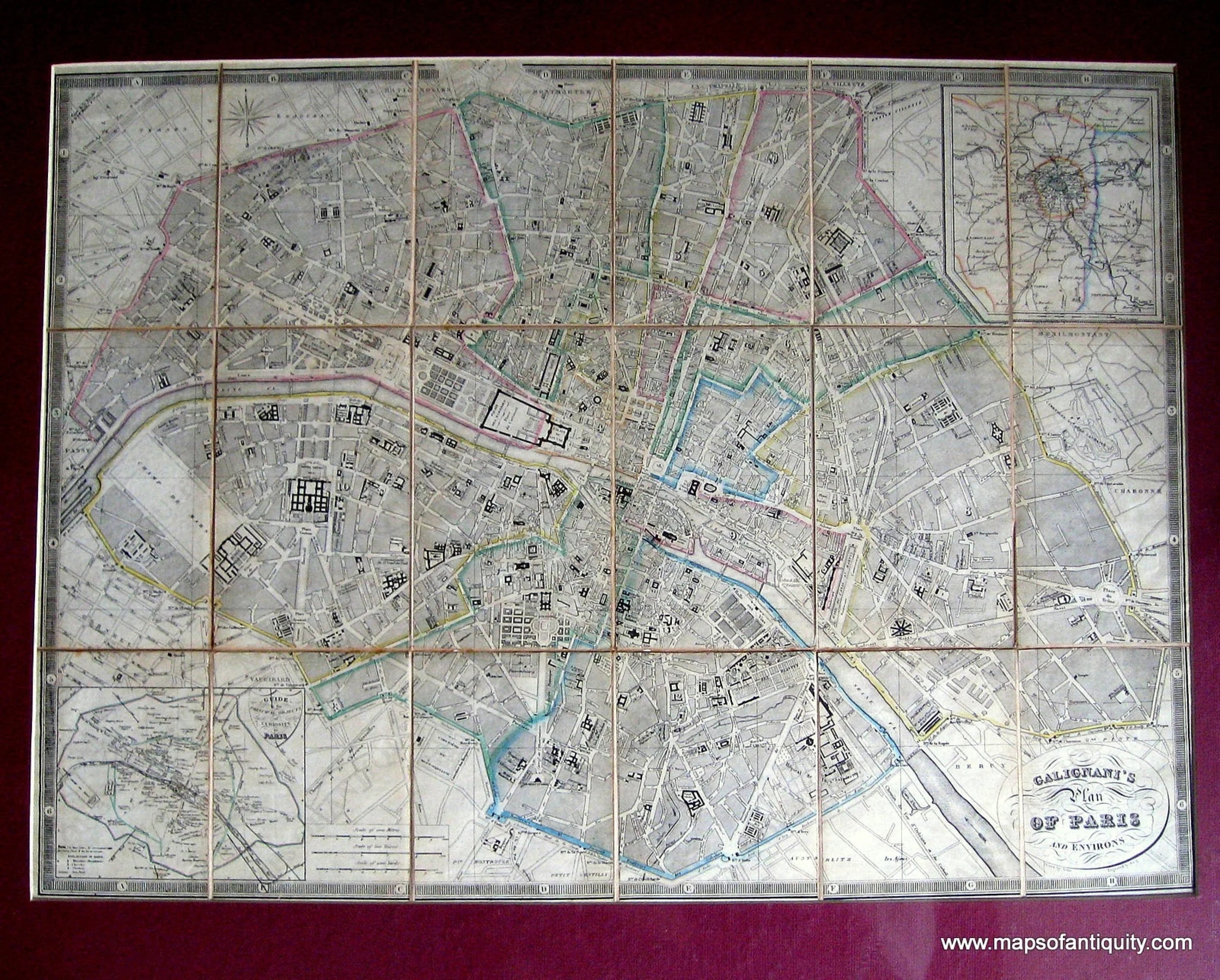 Hand colored antique city plan of Paris, with great detail of streets, avenues, and all major points of interest, and insets of Paris Environs, and Guide to the Principal Objects of Curiosity in Paris. Was folded to “pocket size”, shows separations along fold lines. Very good overall antique condition, some discoloration along fold lines, matted, 16.5 x 22.5 inches.*****SOLD*****