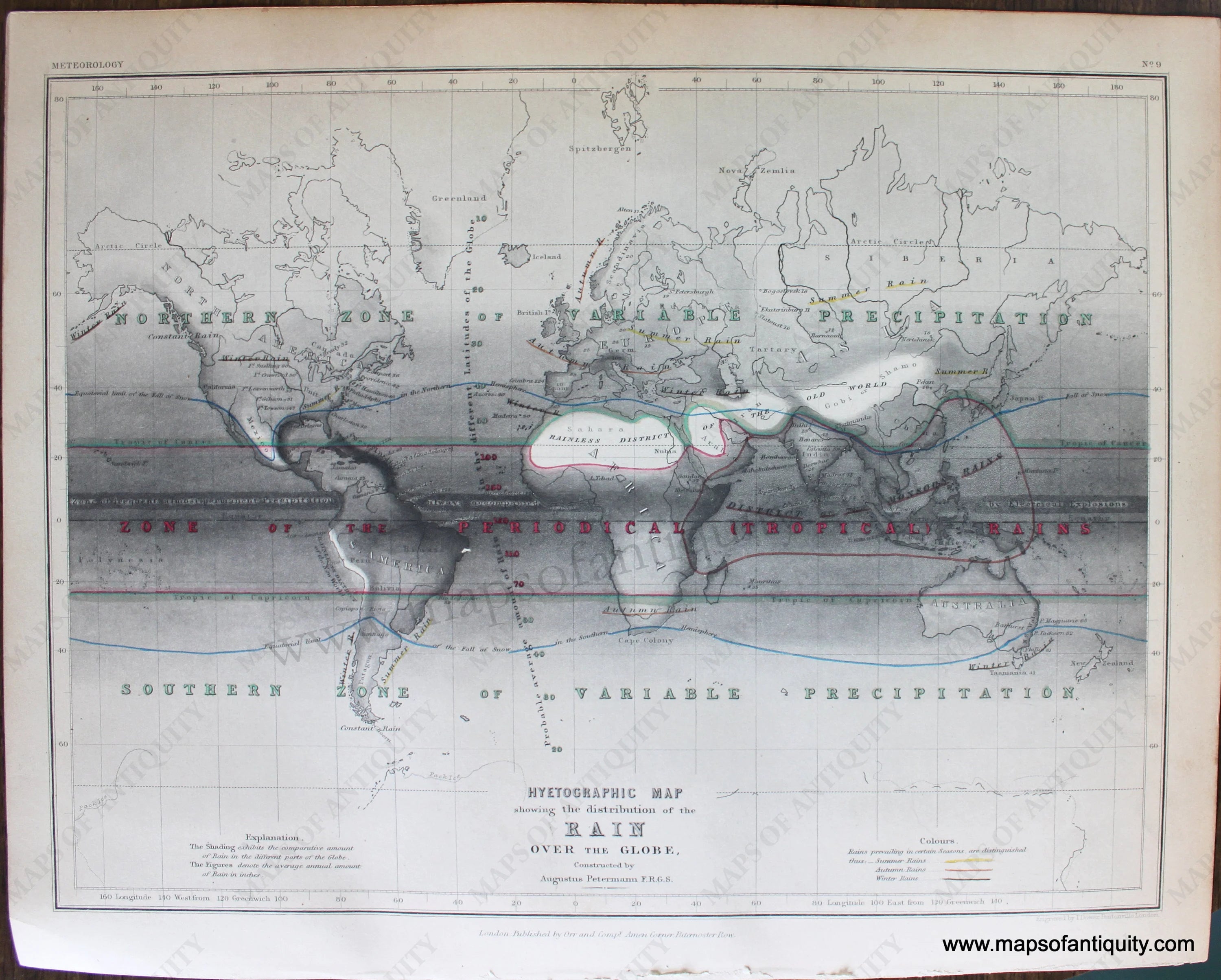 Antique hand colored map of the world showing rain distribution. Engraved by J Dower. From A Descriptive Atlas of Astronomy and of Physical and Political Geography by the Rev. Thomas Milner, maps by Augustus Petermann, and published by William S. Orr & Co, 1850. Very good condition with some minor signs of age, such as spots, toning, and mild image transfer. Tight margin. Page measures approx. 9.25 x 12 inches.