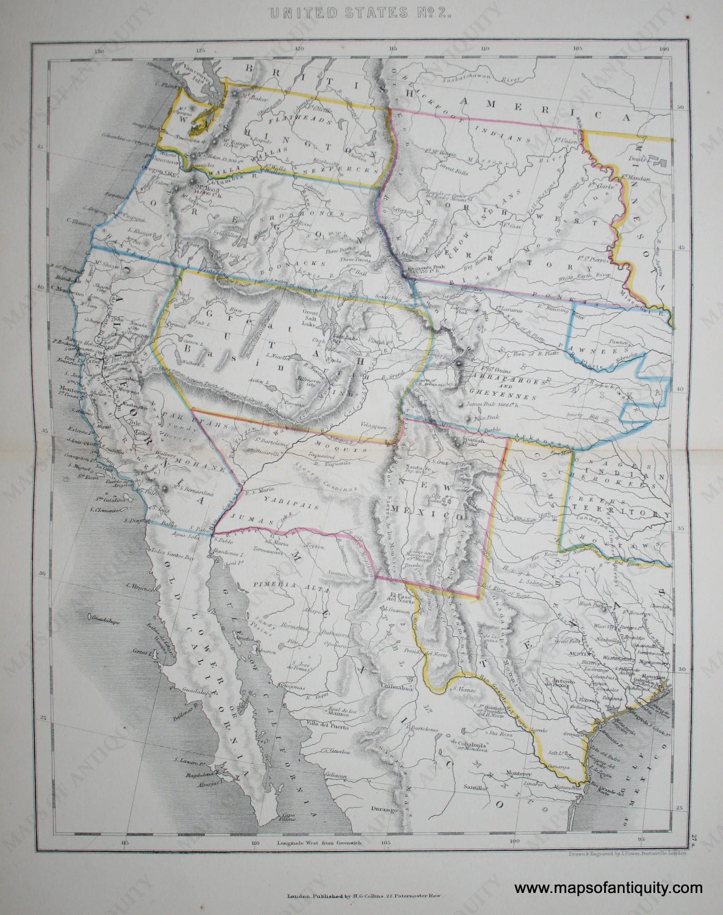 Antique hand-colored map from Appleton’s Modern Atlas of the Earth c. 1850 published by Collins. Map engraver is Archer. This map has fascinating boundaries, including an extra tall Texas, large Utah, oddly shaped New Mexico, Minnesota Territory reaching the Missouri River, Northwest Territory, long Oregon and Washington territories, etc. In fact, the only state with the same boundaries as today is California. Many Native American Indians indicated throughout. Rivers, mountains, named peaks, cities, forts, and more. Very good condition with center fold as issued. Approx. 11.5 x 9.25 inches
