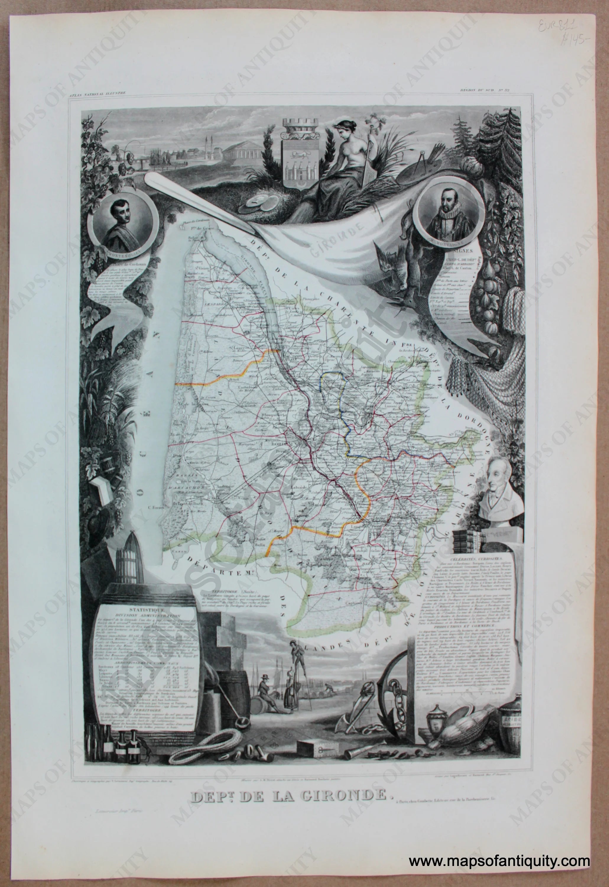 Antique hand colored map of the Department of Gironde, France, from the Atlas National Illustre des 86 Departments et des Possessions de la France, Divise par Arrondissements, Cantons et Communea, by Levasseur, 1851. Surrounded by exquisitely detailed engraved illustrations and vignettes, as well as statistical and general information. Good to Very good overall antique condition with mild toning and wrinkling throughout, areas of mild foxing, and some minor edge wear. Measures approximately 16.5″ x 11.25″ (H x W) to the neatline.