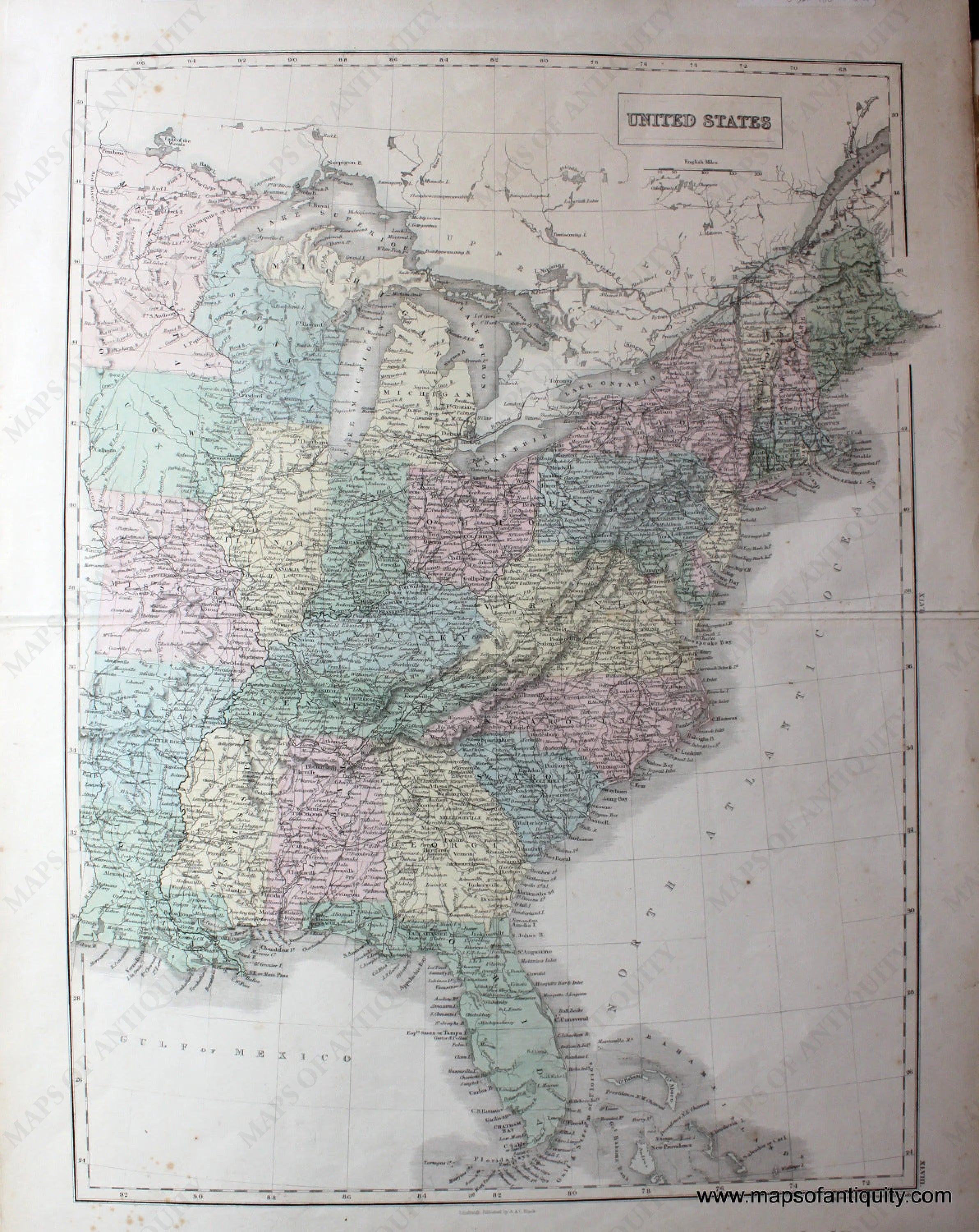 Antique hand colored map of the eastern half of the United States from 1851 by Black. Includes from Louisiana and Minnesota to Maine and Florida and shows land and water forms, rail roads, cities, major roads, and part of the Bahama Islands. Very good antique condition with some very light minor spotting. approx. 20 x 14.5 inches to neatline. **SOLD**