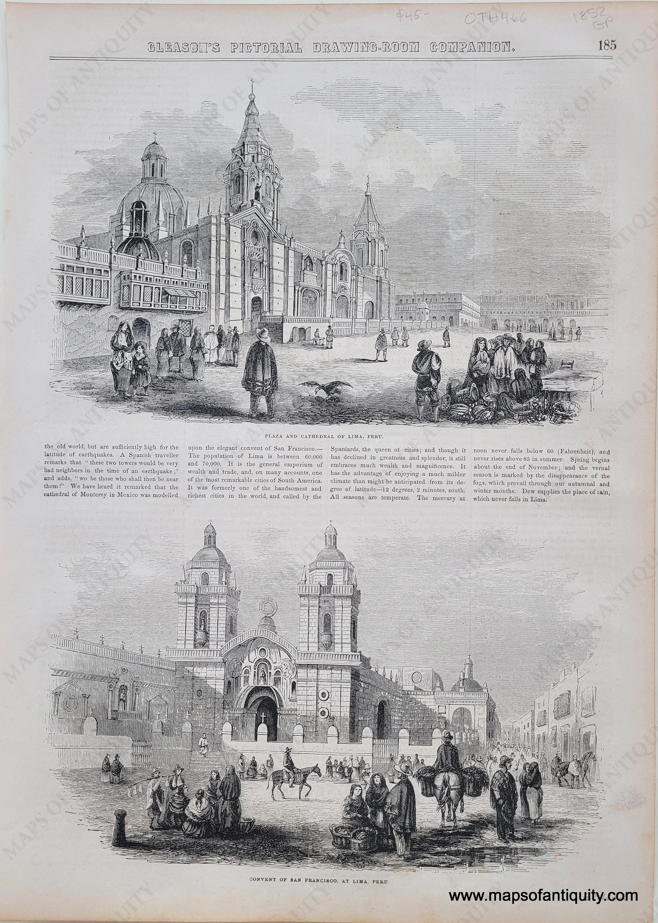 Antique illustration from Gleason’s Pictorial Drawing Room Companion, 1852. Two illustrations of Lima, Peru, with text description. Very good condition with minor signs of age. Could be hand-colored by our professional colorist for an additional cost (please contact us if interested). Page measures approx. 8.25 x 11 inches.