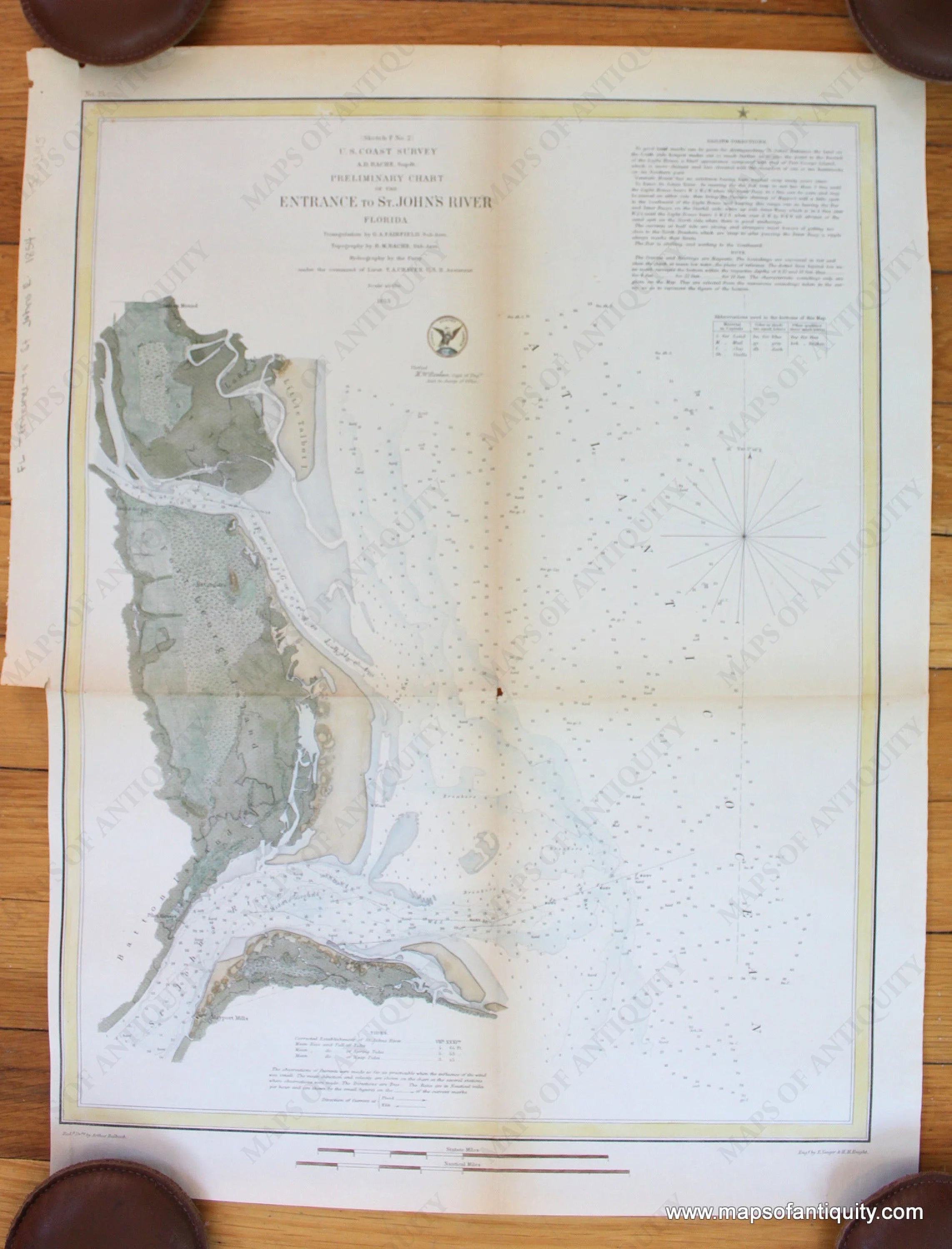 Hand colored antique coast chart of St. Johns River, by the US Coast Survey, 1853. Includes Mayport, Fort George Inlet, Fort George Island, and Little Talbot. With water depths, bathymetric data, and sailing directions. Very good condition with toning along the folds and paper edges, small paper loss at fold intersection, and smaller margin on left side. Approx. 18 x 14 inches to the neatline.