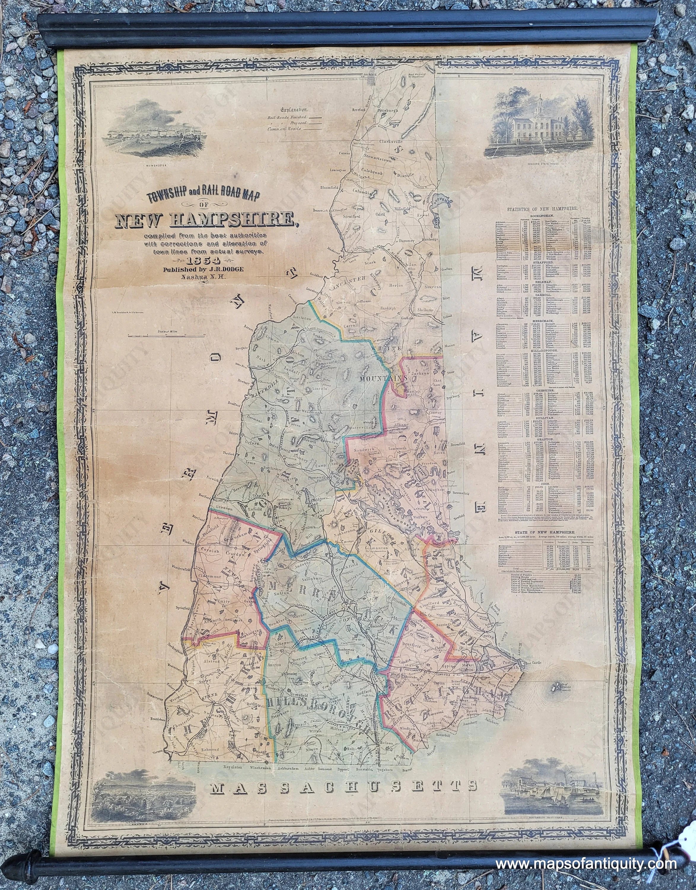 Township and Railroad Map of New Hampshire compiled by the best authorities with corrections and alterations of town lines from actual surveys with statistics of New Hampshire by county and town including population and valuation, four engravings, decorative border, roads and railroads, about 24 1/2″ x 34 1/2″ in good condition. Map has been cleaned, rebacked, restored, and de-acidified. Map is evenly toned with some creases as shown. **NOTE- because this map requires extra insurance for shipping, an additional charge will appear on your card after your original purchase. If you would like to know what that charge will be, please contact us.**