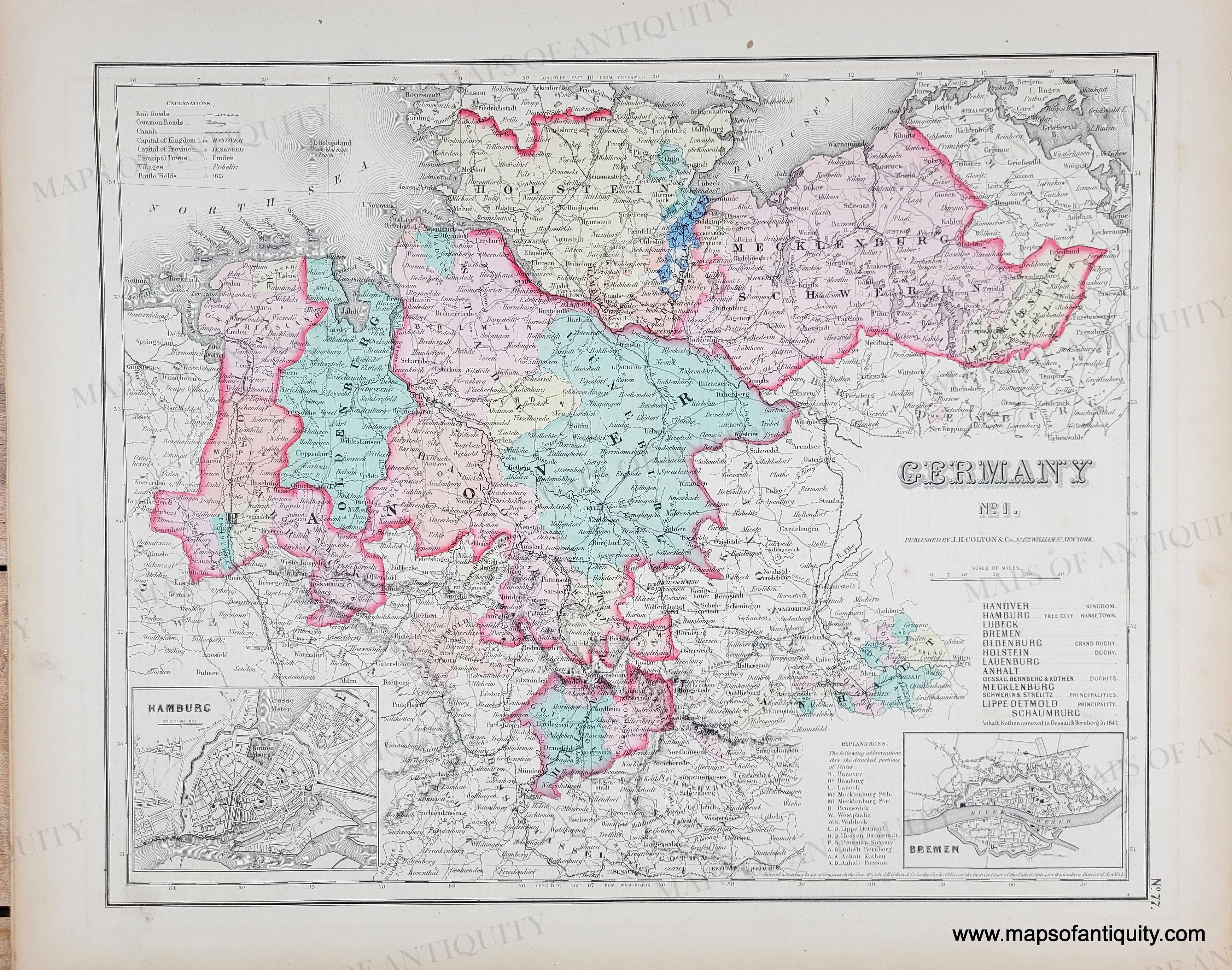 Antique Map of Germany No. 1 by Colton, 1855. The Colton firm refused to compromise quality, choosing to compete for sales in the finer quality international market rather than the inexpensive domestic one. Because of this, all maps were engraved by steel plates rather than by wax engraving which was the most common method used at this time. Very good antique condition with mild toning, some small spots and some small wear/tears at the paper edges. Measures approx. 15.5 x 12.5 inches to the decorative border.