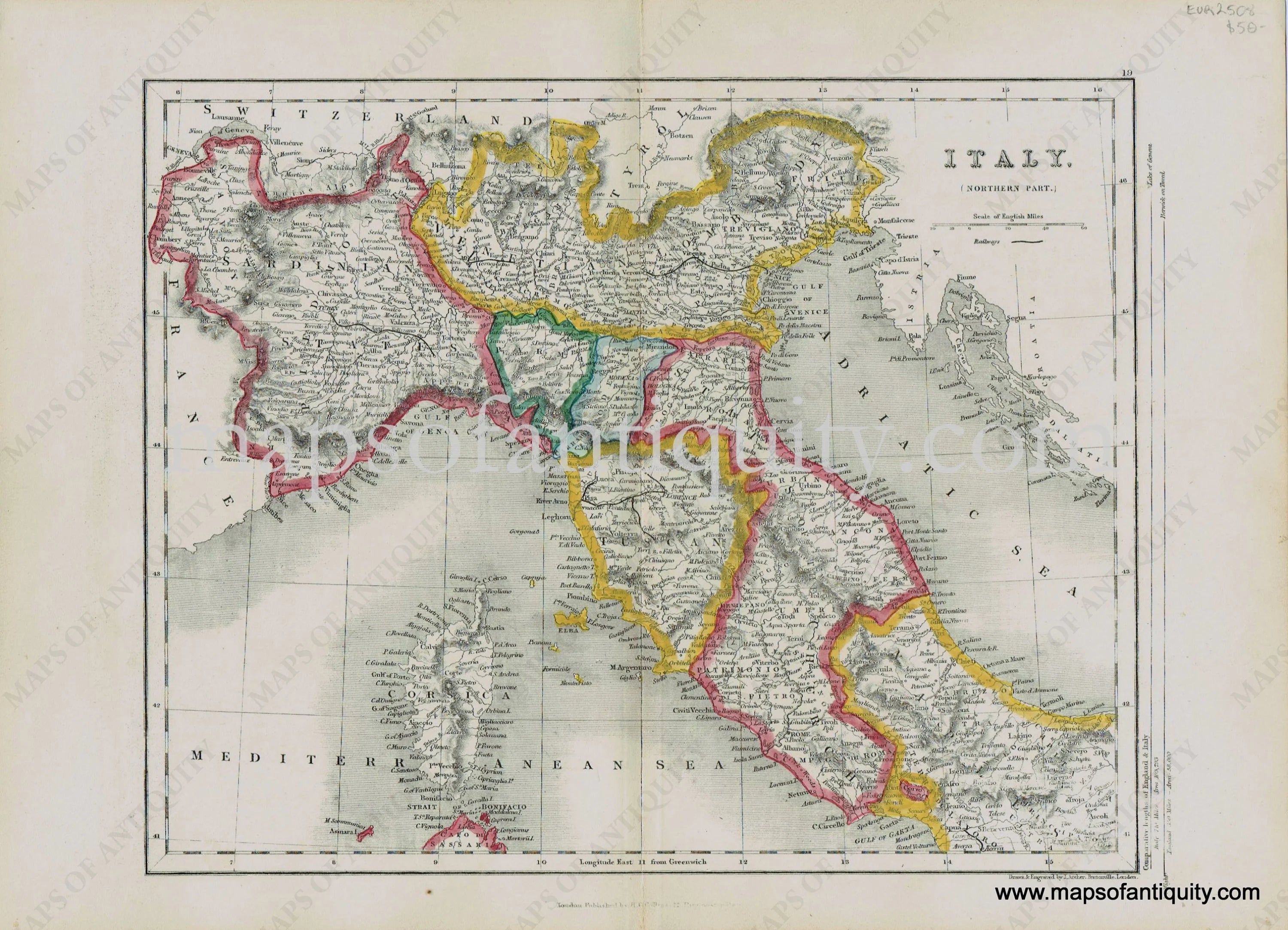 Antique hand colored map of central and northern Italy, by J. Archer and published by H.G. Collins in “The College Atlas, for Schools and Families” c. 1860. Map includes cities and towns, topography, some railroads, and is colored by state. On right side is a graph showing the comparative lengths of England and Italy. Very good condition with fold as issued in the atlas and some seam separation at top and bottom of fold. Approx. 9 x 11 inches to the neatline.