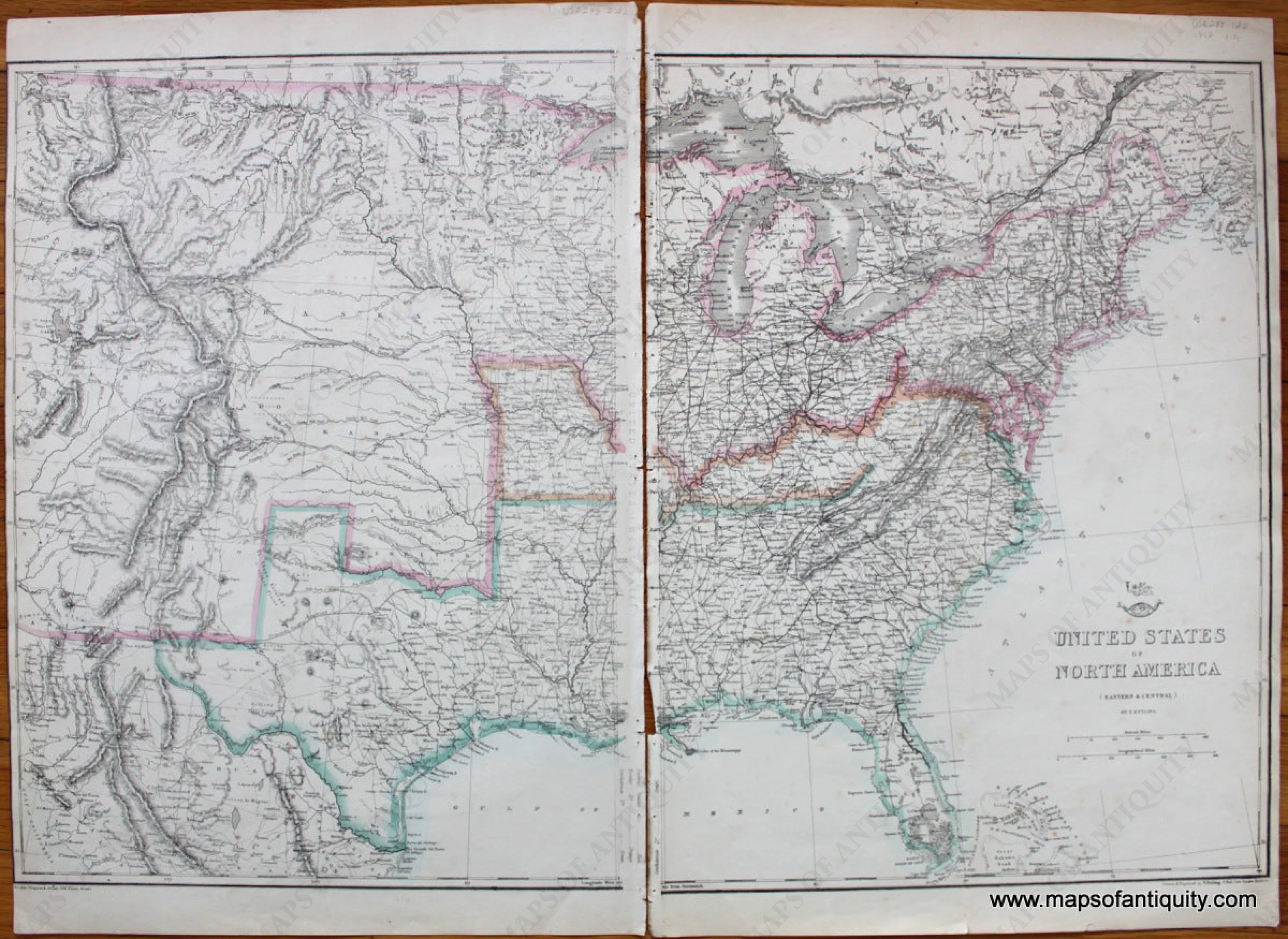 Hand colored antique map of the eastern and central US by Ettling, published in the Weekly Dispatch Atlas, 1863. The coloring of this map shows the Confederate states in the south as green, the “Border States” are orange, and the Federal states are pink (called red in the key). On this map New Mexico is shown above Arizona and, notably, Arizona is not shown as a Confederate territory, which it did become for a brief time in 1862. Other features of this map include a large Washington state that stretches to Utah, a huge Dakota that spans from Washington to Minnesota and a Nebraska that is equally large. This map is in two sheets that can be joined (contact us if you with us to join them when you purchase them). Good condition with some edge wear, a tightly cropped left margin, and some light foxing. Each sheet measures approx. 17 x 12.5 inches to the neatlines. **SOLD**