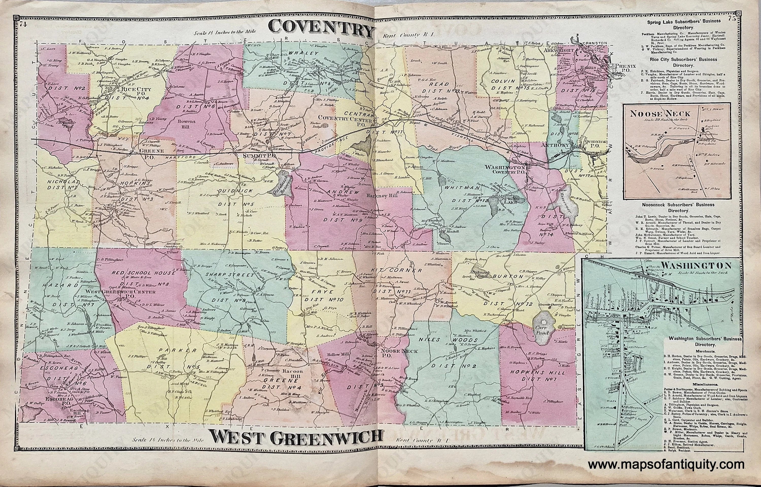 Antique map of Coventry and West Greenwich, RI, from the Atlas of the State of Rhode Island and Providence Plantations, Beers, 1870. With inset maps of Noose Neck (part of West Greenwich) and Washington (part of Coventry). Good condition, with toning, small tears at paper edges, and a water stain at bottom that can be hidden by a mat when framing. Measures approx. 14.5 x 24 inches.