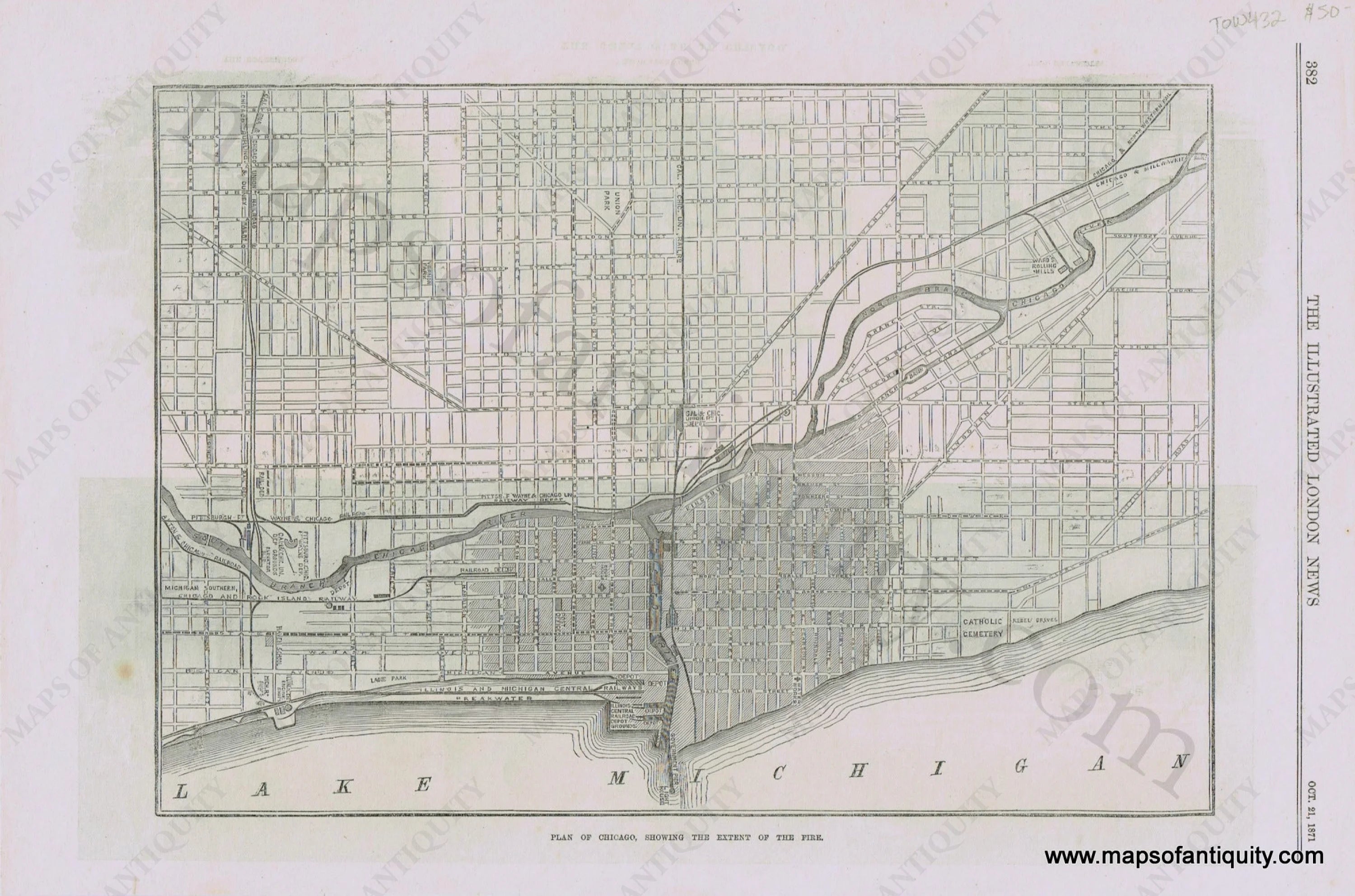 Antique black and white map of a portion of the city of Chicago showing the reaches of the Great Chicago Fire which took place October 8th -10th, 1871. On verso is a page of black and white illustrations (View of Chicago from Lake Michigan, The Courthouse, The Waterworks, The University.) Published in The Illustrated London News, October 21, 1871. Very good overall antique condition with some very mild toning and foxing of the paper. Map measures approximately 8.5″ x 12.25″ to the neatline. Page measures approximately 15.75″ x 10.5″ in its entirety. **SOLD**