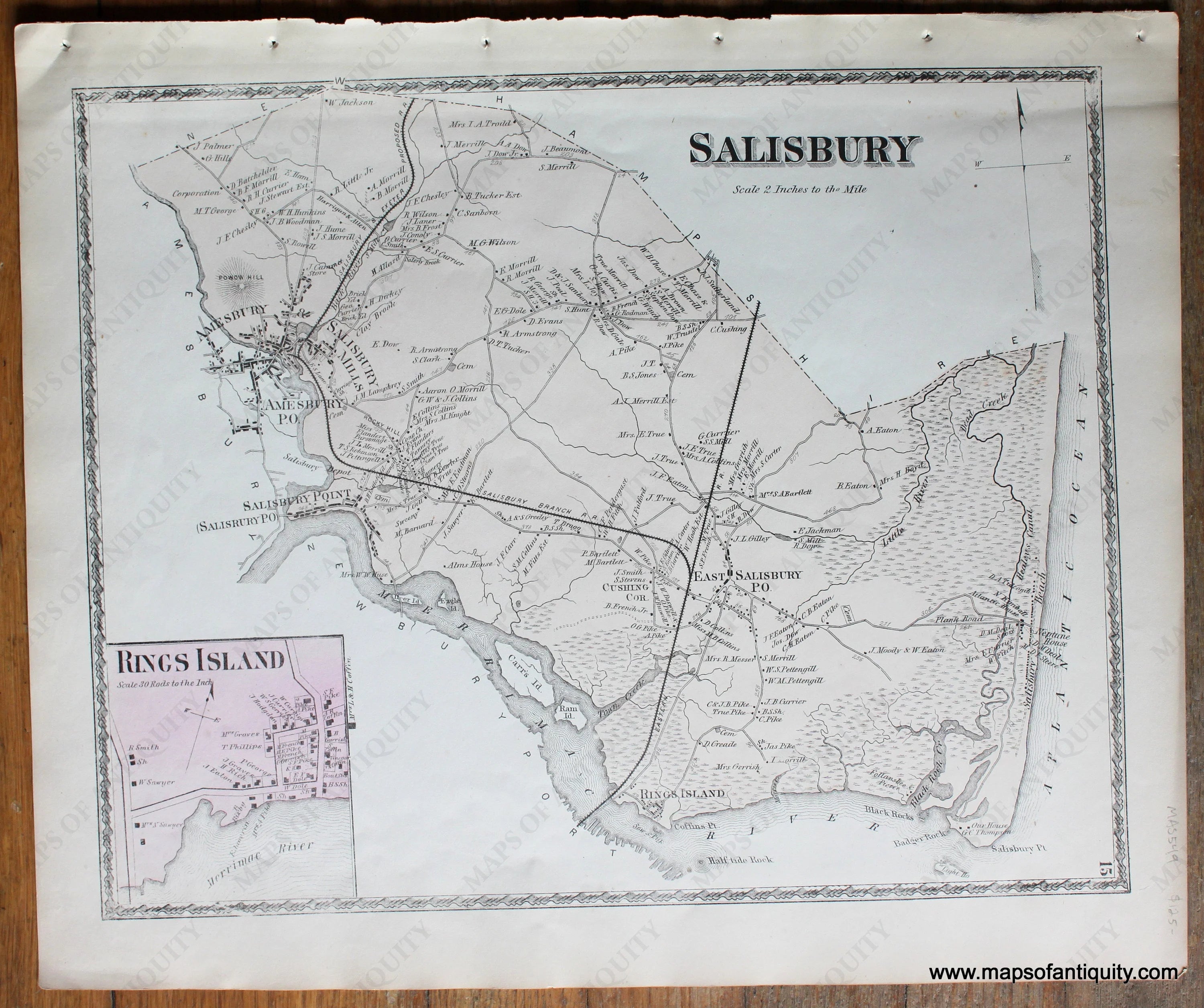 Town of Salisbury with inset map of Rings Island, streets, property owners, Powow River, from the Atlas of Essex County Massachusetts, by D.G. Beers & Co., 1872. Very good antique condition, minor toning and foxing, original hand color, approx. 12 x 14.75 inches.