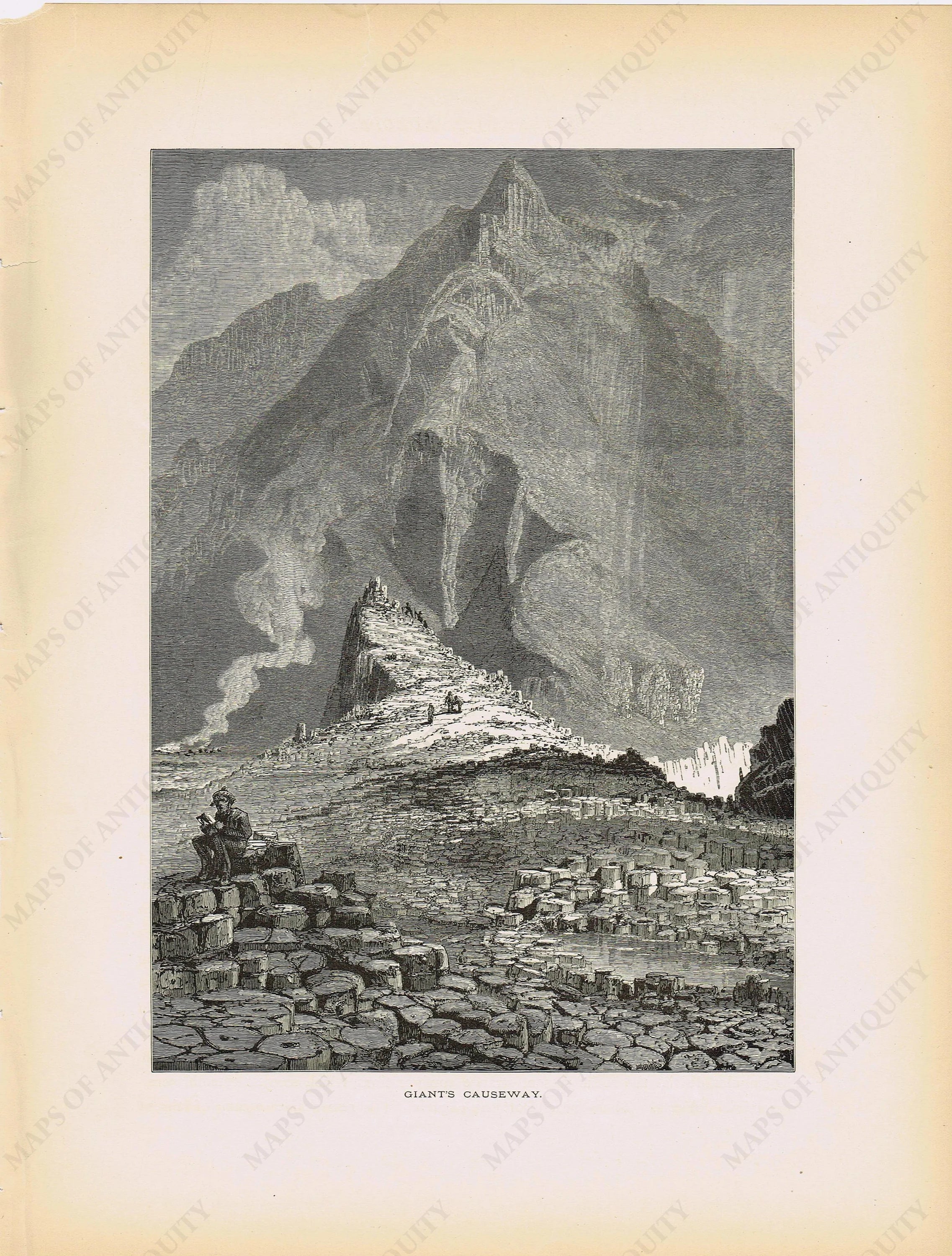 Antique woodcut engraving print published in Picturesque Europe, shows basalt columns of Northern Ireland with mountain in background. The Causeway is located in County Antrim on the north coast of Northern Ireland, about three miles (5 km) northeast of the town of Bushmills. Very good condition with minimal signs of age as pictured. Measures approximately 11″ x 8″ to just outside the printed image including text.