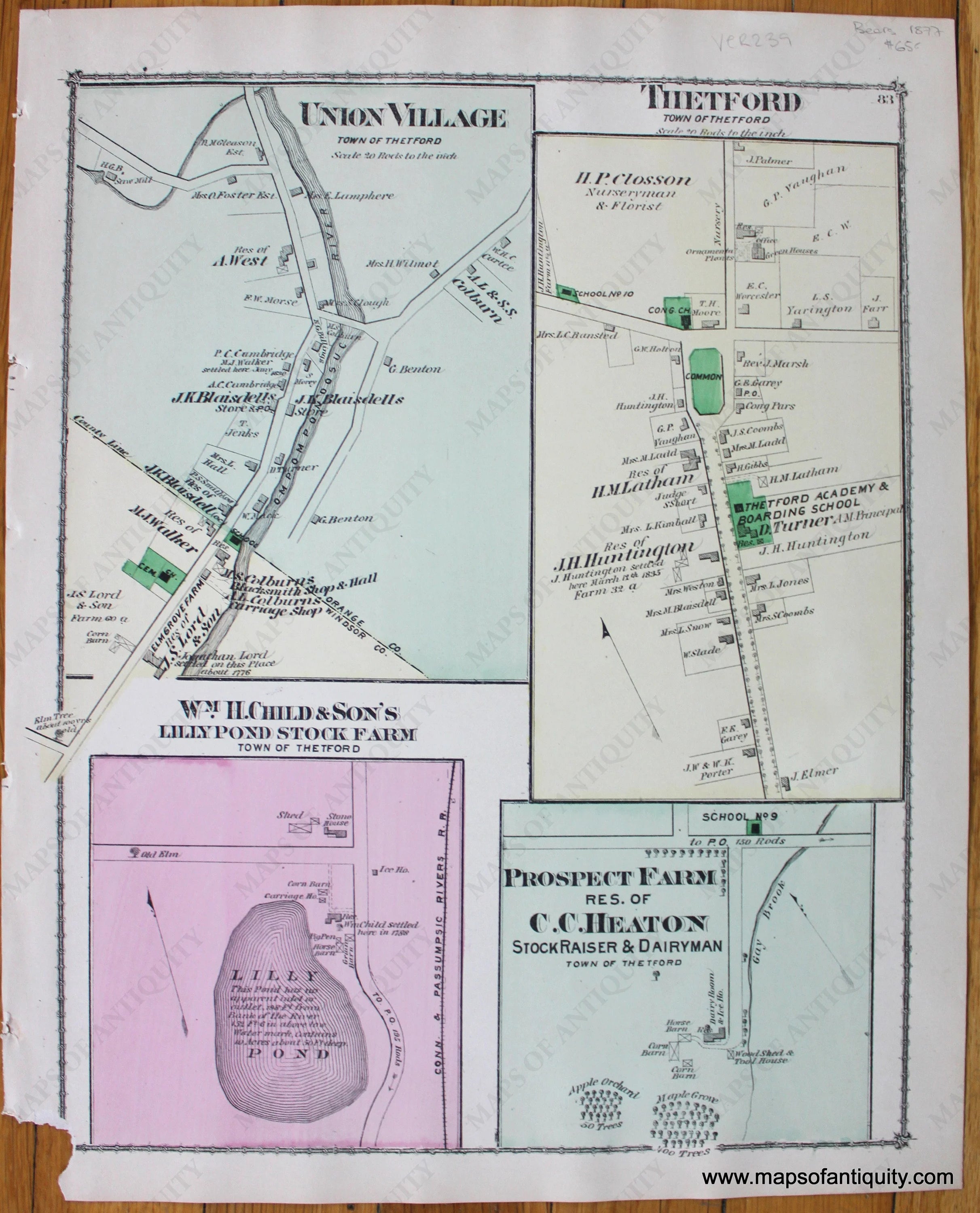 Antique hand colored lithographed map of from the Atlas of the County of Orange Vermont Published by F.W. Beers & Co in 1877. Shows major land and water features, districts, land and property owners, post offices, churches, cemeteries, municipal buildings, etc. In fair to good antique condition with slight toning and foxing, paper loss at bottom left. Measures approximately 11 x 14.5 inches.