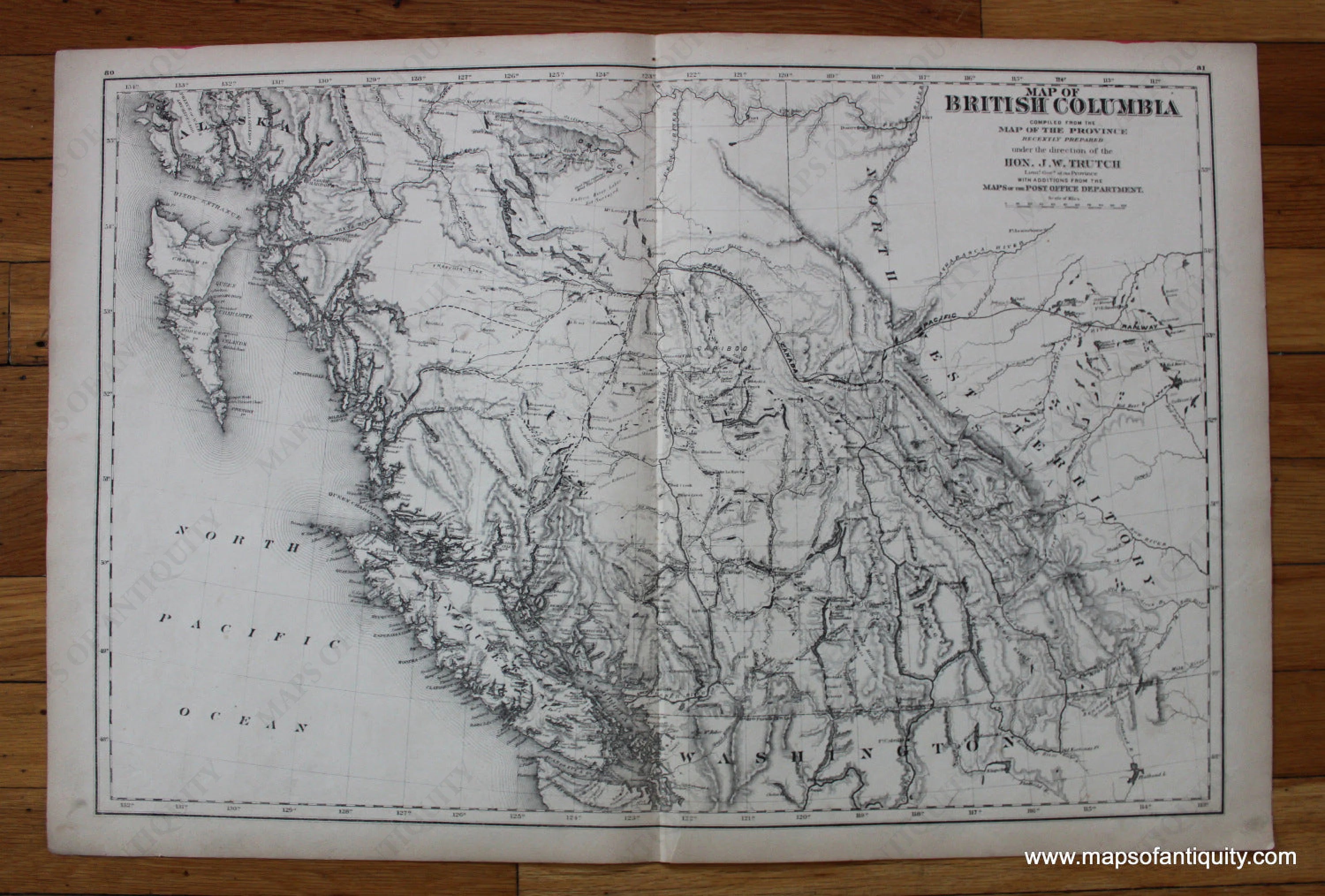 Antique black and white map of British Columbia. Includes Vancouver Island, as well as the bordering Alaska and Washington. Good condition with some slight overall toning and a small tear at the bottom edge. By Belden, in The Illustrated Atlas of The Dominion of Canada, 1881. Approximately 16″ x 24″ to the neatline. **SOLD**