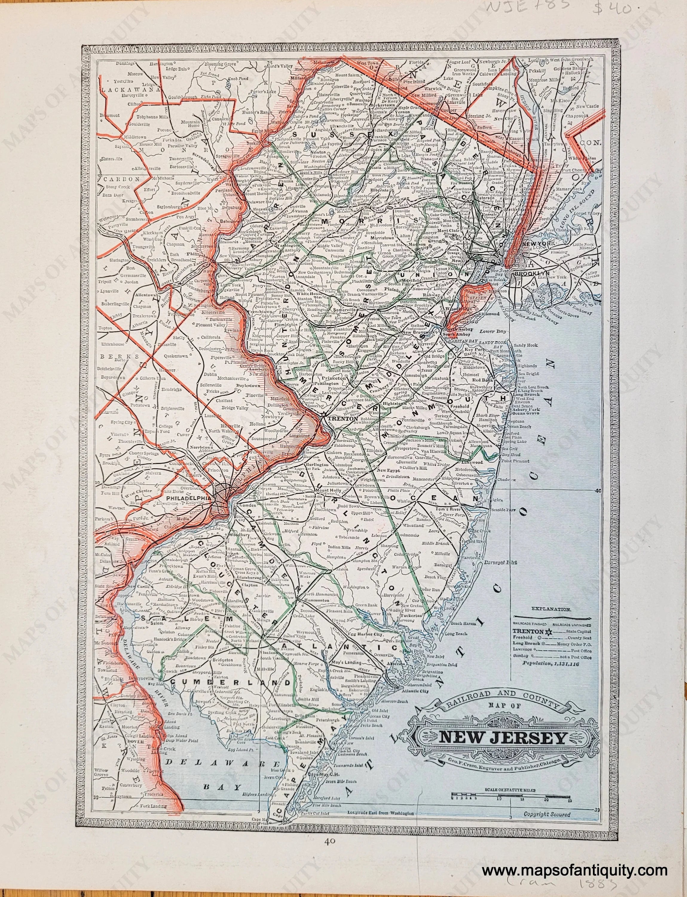Antique double-sided page with printed-color map of Pennsylvania on one side and New Jersey on the other. By Cram, 1883. Very good condition with minor toning and other signs of age. PA map measures approx. 11.5 x 16 and NJ map measures approx. 12 x 8.25 inches to the decorative border.