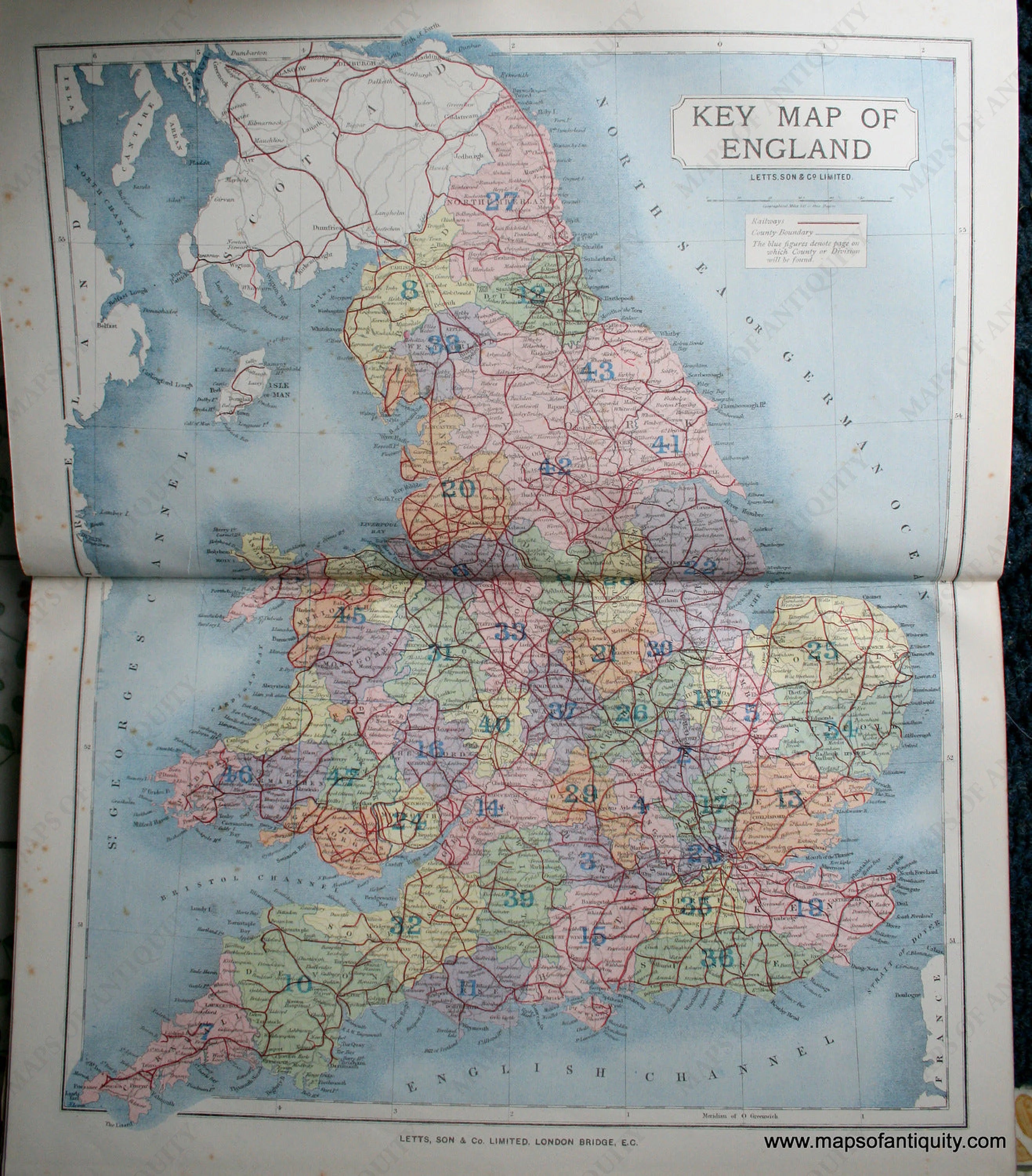 Antique printed color map from Letts’ Popular County Atlas of England and Wales. Good with center fold as issued and some minor imperfections and foxing. Approx. 16 x 13 inches