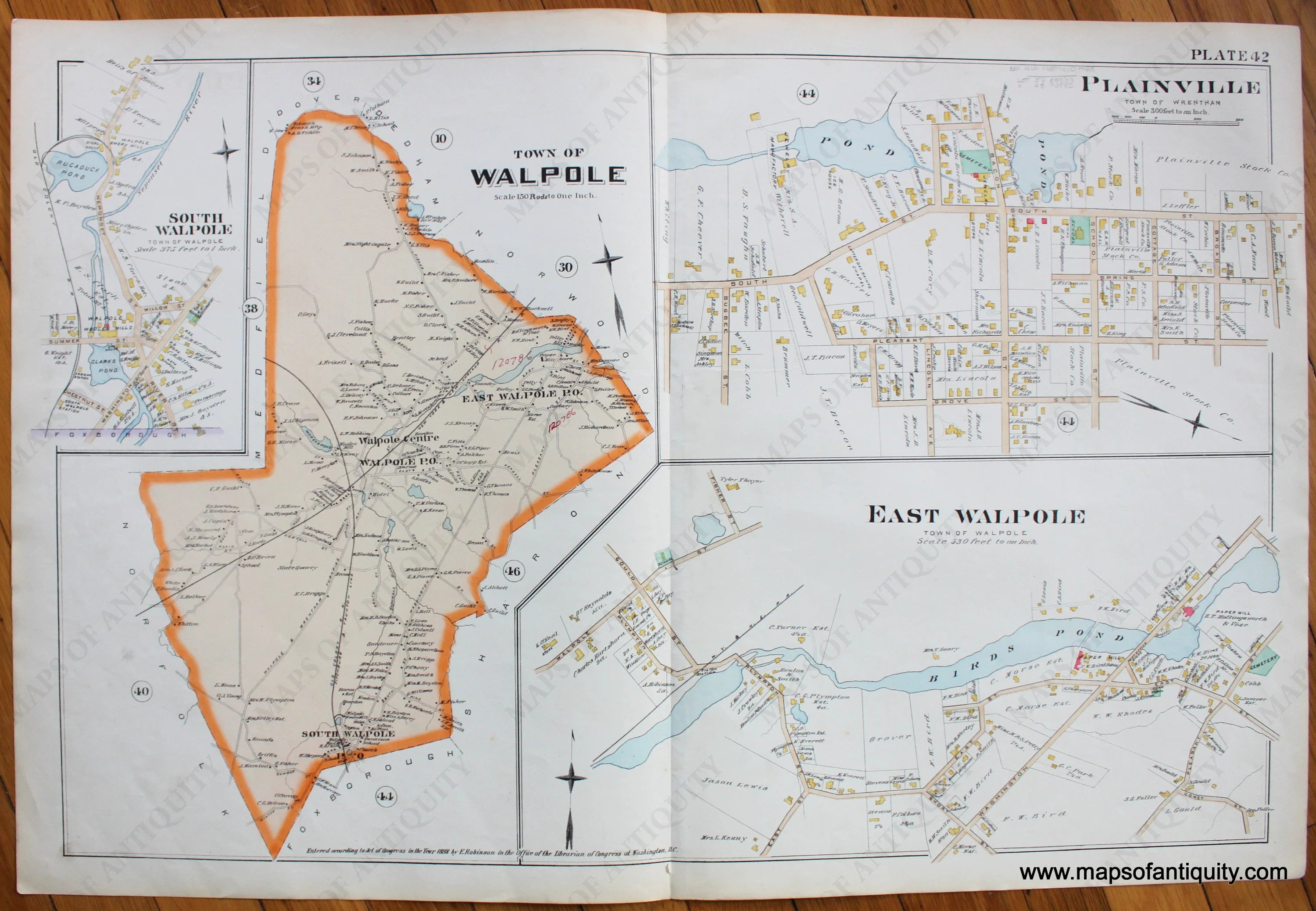 From the Atlas of Norfolk County, by Robinson, 1888. Antique hand colored map of the towns of Walpole, Plainville, East Walpole, South Walpole, Massachusetts, includes property owners’ names and building footprints, overall very good overall antique condition, double sheet measures approx. 18.5 x 28.25 inches.