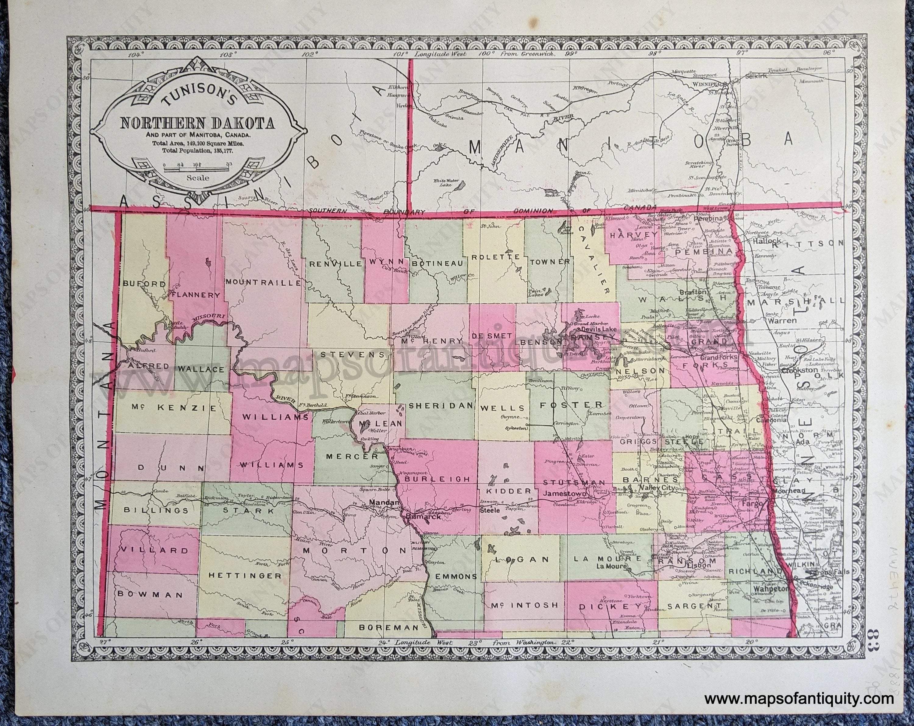 Antique double-sided sheet from Tunison’s Peerless Universal Atlas of the World, c. 1888 by H.C. Tunison. At this time Dakota was a territory and had not been separated into two states. On one side is a map of the northern part of Dakota Territory, on the other side is a map of the southern part of Dakota Territory. Both maps are colored by county with early county configurations. Vibrant original color. Fair to good antique condition with some minor foxing, stains, and smudges, and some small wrinkles. The strike on some pages in this atlas is a bit faint. Measures approx. 14 x 11 inches to the paper edges.
