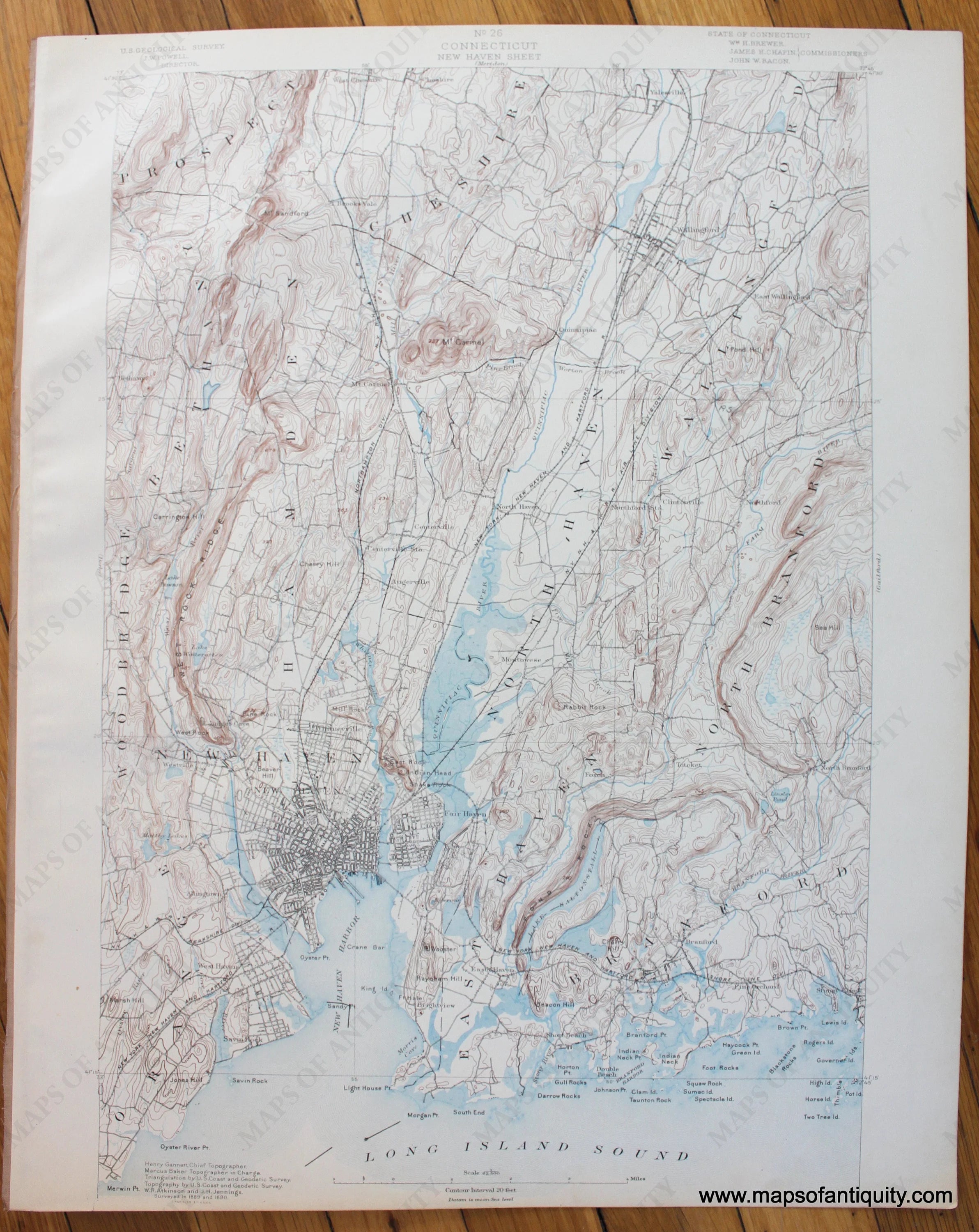 Antique printed color topographical map showing New Haven, East Haven, North Haven, Hamden, Wallingford, Branford, CT, New Haven Harbor, Long Island Sound, etc. Sheet No. 26. Good overall antique condition with toning and wrinkling of the paper. Measures approximately 19.75″ x 13.25″ (H x W) to the neatline.