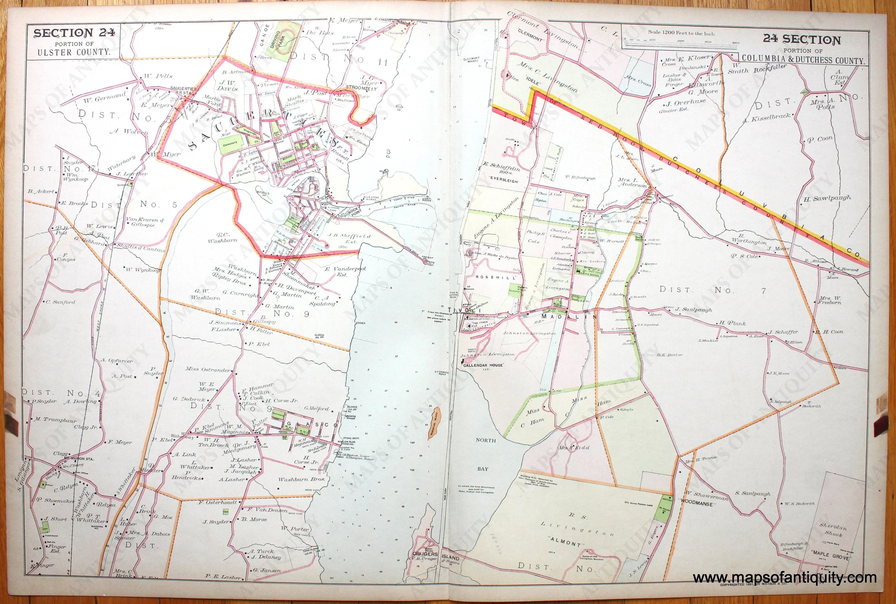 Antique hand colored map from the Atlas of the Hudson River Valley from New York City to Troy Including a Section of about 8 Miles in Width published in 1891 by Watson & Co. under the supervision of F.W. Beers. Includes part of the town of Saugerties, part of the town of Redhook, part of the town of Clermont. Shows property owners, parks, cemeteries, railroads, borders, major land and water features etc. In good to very good antique condition with toning, slight wear at the paper edges, and marks from the leather tab in the margins. Some wear at lower corners. Some pencil notations. Backed with linen, with center fold as issued. Measures approximately 19.5 x 29 inches to the neatline.