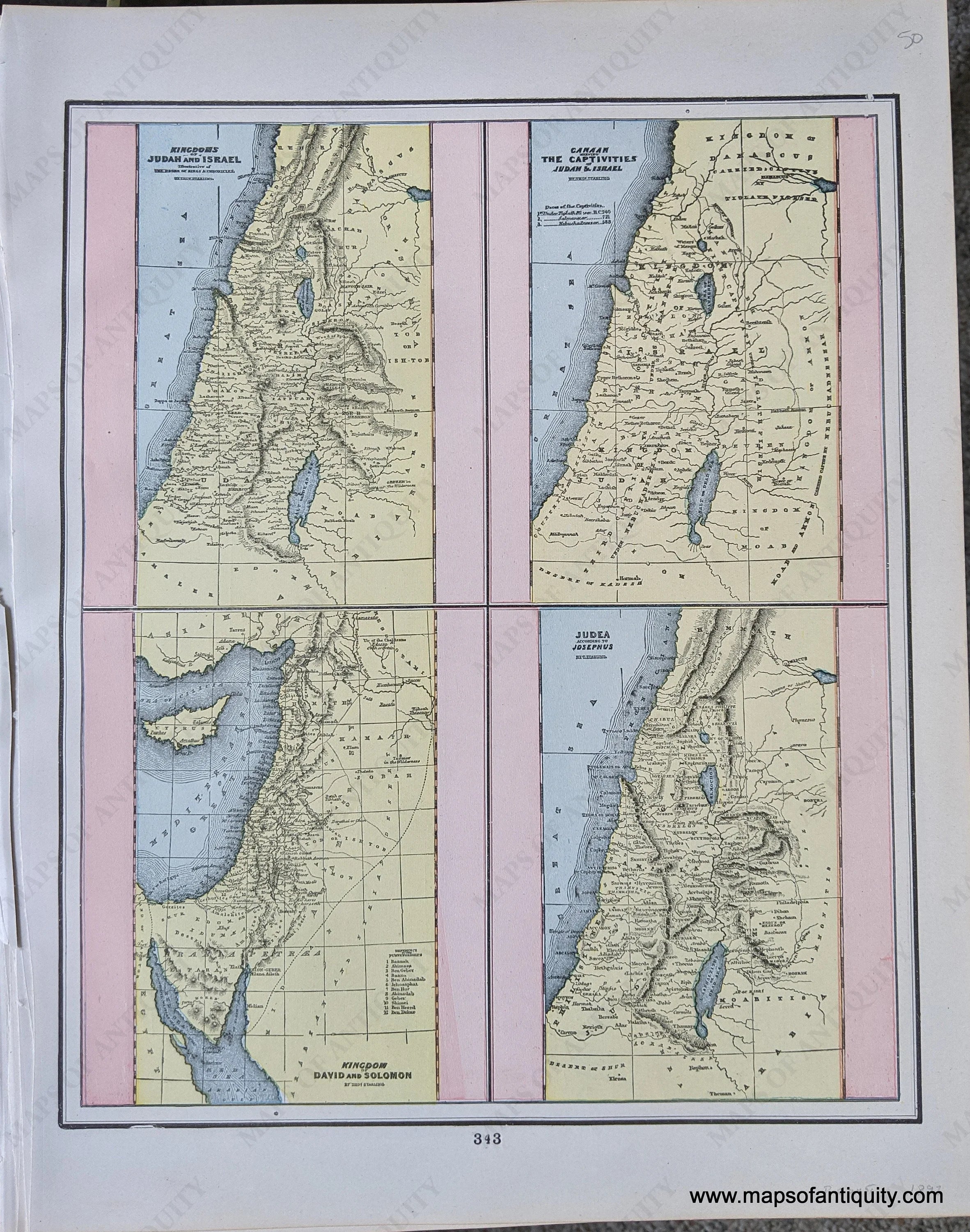 Antique printed color maps published in “The Pacific Coast and the World” by the Home Library and Supply Association, 1892. Side one four maps: Kingdoms of Judah and Israel, Canaan showing the Captivities, Kingdom of David and Solomon, Judea According to Josephus; verso: Four maps: Canaan of the Land of Promise, Land of Canaan, Mesopotamia, Journeying & Encampments of the Israelites from Egypt to Canaan. Very good overall antique condition with some very mild toning/foxing (mainly at the outer edges.) Measure approx. 12 x 9.25″ to the neatline.