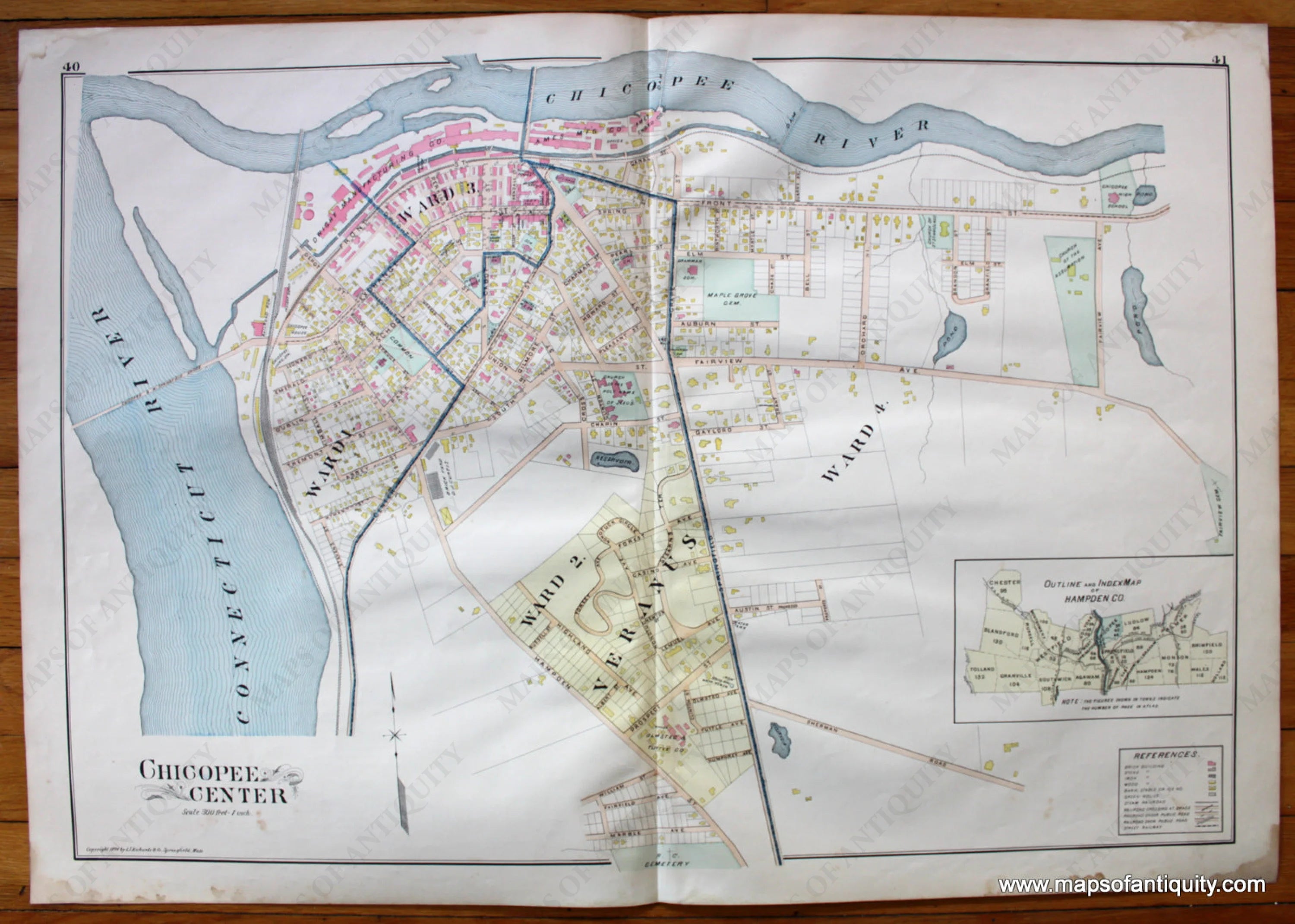Antique hand colored map from the New Topographical Atlas of the County of Hampden, Massachusetts published in 1894 by L.J. Richards. Shows major land and water features, streets, railroads, notable buildings, cemeteries, property owners, and inset Outline and Index Map of Hampden County. In good antique contition with overall toning and foxing, seam at center fold as issued, rough paper at edges outside of neatline, water damage at bottom right. This double page map measures approximately 20.5 x 30 inches to the neatline.