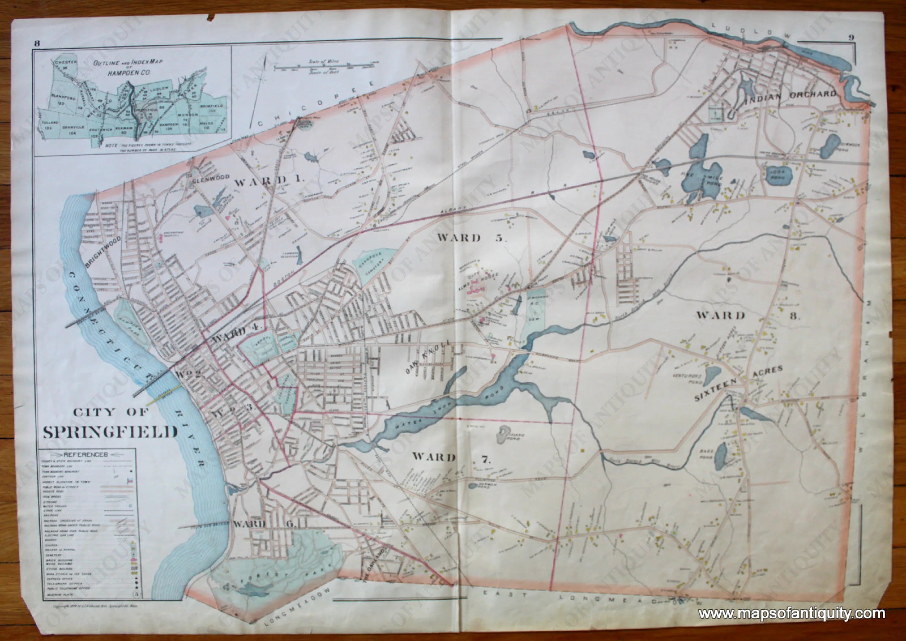 Antique hand colored map from the New Topographical Atlas of the County of Hampden, Massachusetts published in 1894 by L.J. Richards. Shows major land and water features, streets, railroads, notable buildings, cemeteries, property owners, etc. In good to fair antique contition with overall toning and foxing, seam at center fold as issued, rough paper at edges outside of neatline with minor tears and mild paper loss at edges. This double page map measures approximately 20.5 x 30 inches to the neatline.