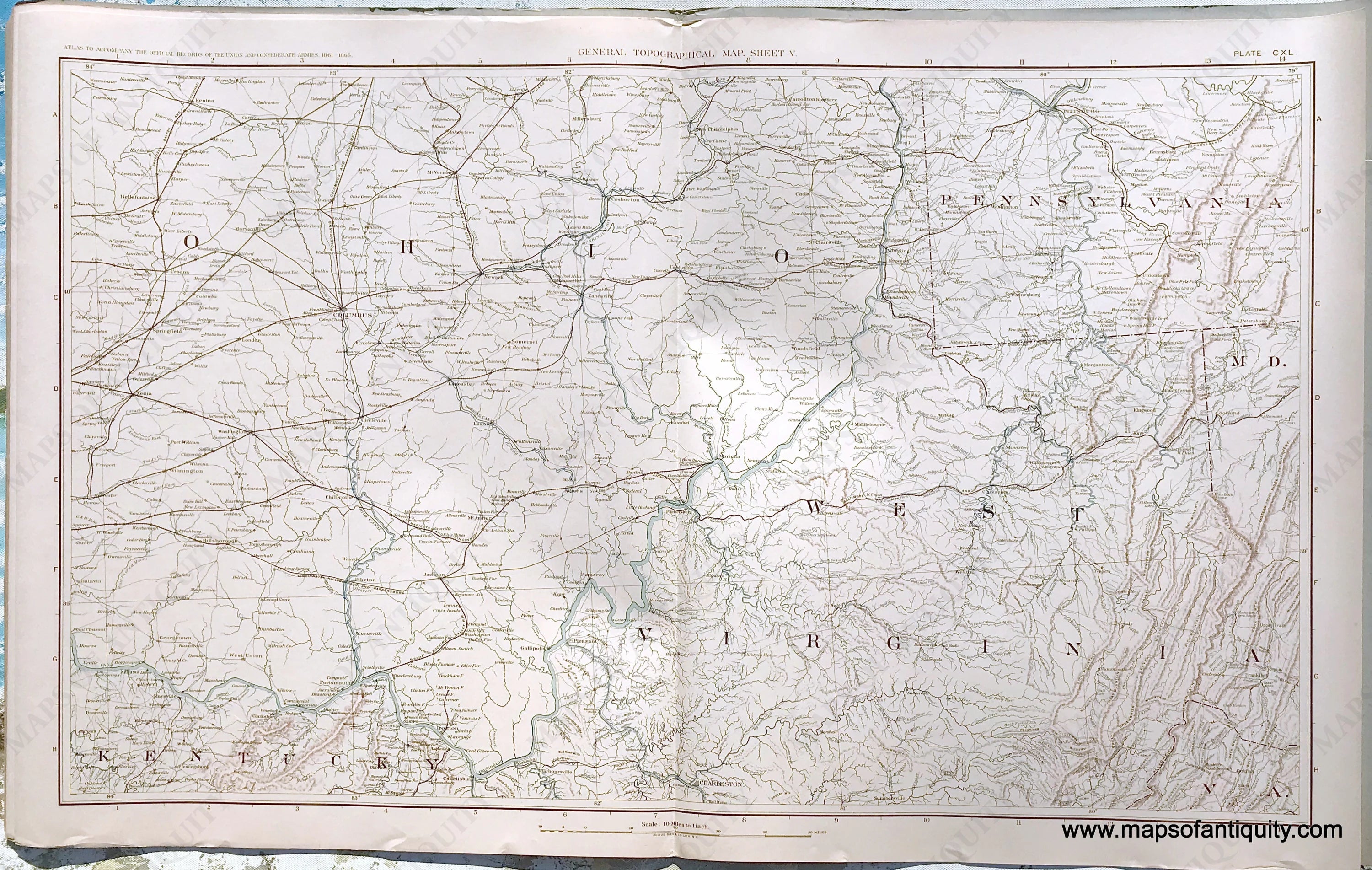 Full title: Plate 140. General Topographical Map. Sheet V. Sections of Ohio, Pennsylvania, Kentucky, West Virginia and small sections of Virginia and Maryland. Antique lithograph by Julius Bien & Co published in the Atlas to Accompany the Official Records of the Union and Confederate Armies published under the direction of the Hon. Daniel S. Lamont, Secretary of War, 1894. The atlas was published as a companion piece to the Official Records of the American Civil War. It contains maps and other images derived from materials generated by both Union and Confederate military personnel during the American Civil War. The atlas was printed in 35 parts between 1891 and 1895. Printed color indicates topography. Very good condition with mild image transfer, a few minor spots/stains and a touch of foxing, and some staining and wear to the paper edges. Measures approx. 16 x 27 inches to the outer border lines.