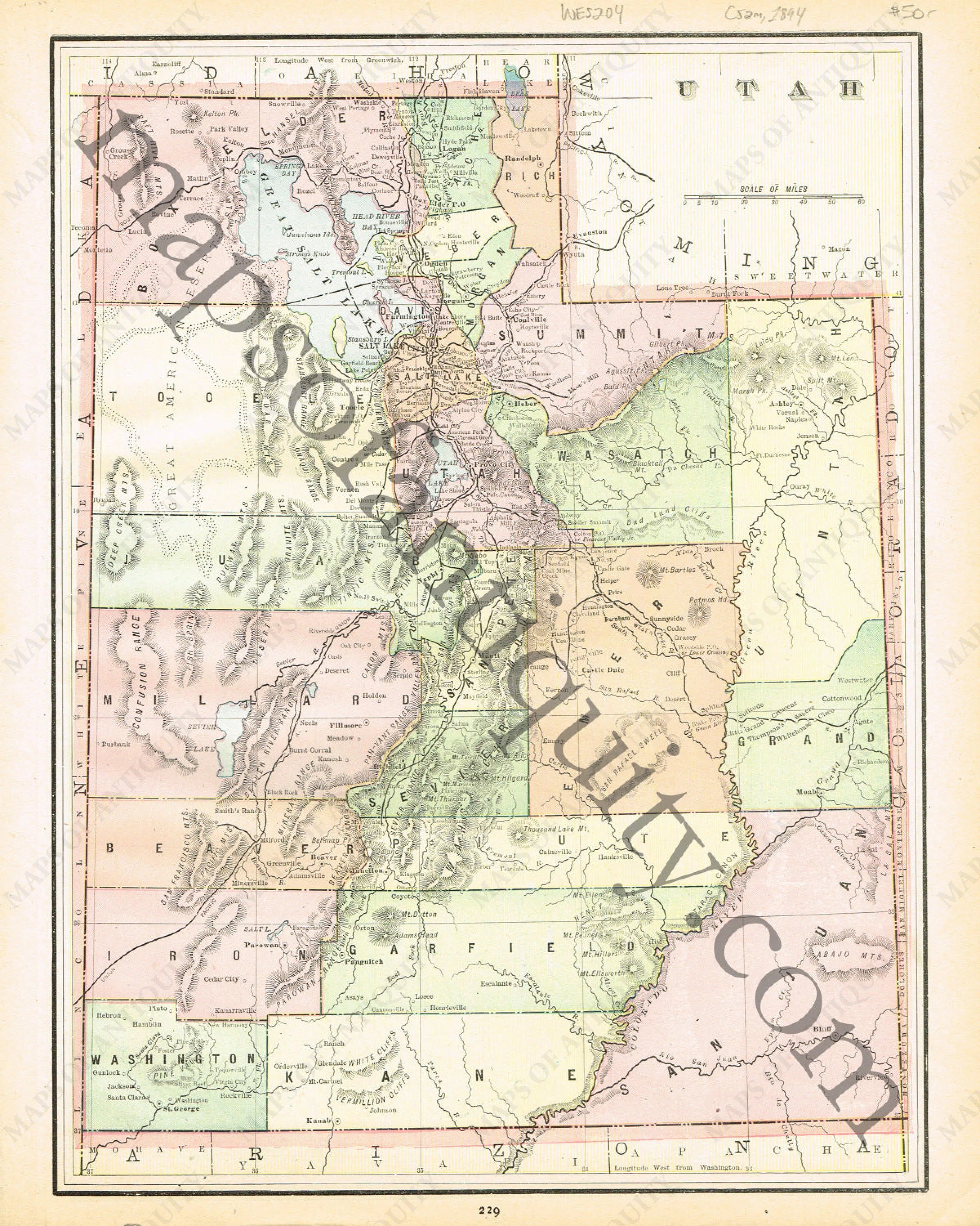 Antique printed color map of Utah (Recto). Verso: Map of Idaho. Very good condition with some slight toning at the edges. By Cram, in The Standard Atlas and Gazetteer of The World, 1894. Recto: Approximately 13.5″ x 10″ to the neatline. Verso: 13.5″ x 9.75″ to the neatline.