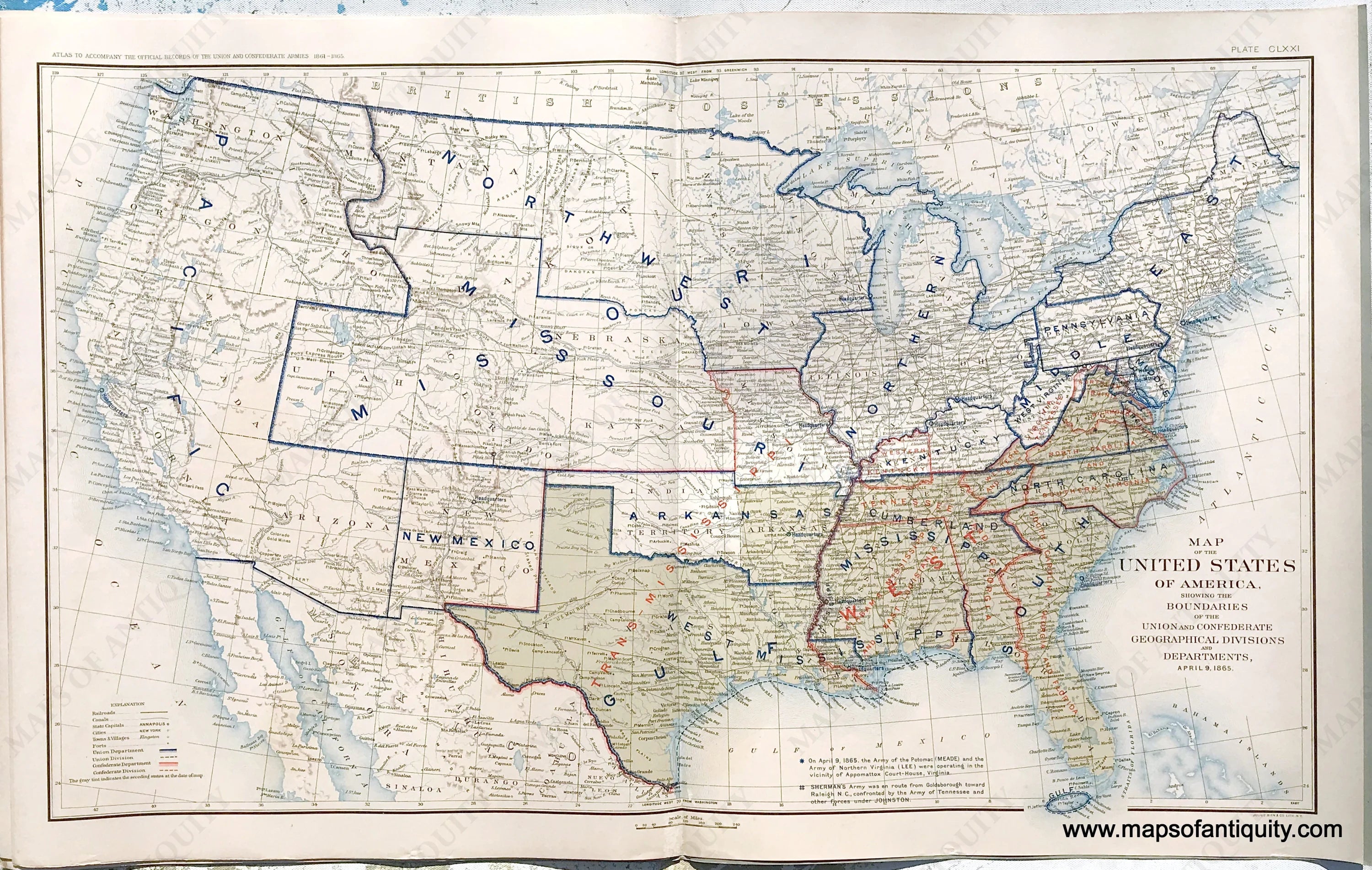 Full title: Plate 171. The United States of America showing the Boundaries of the Union and Confederate Geographical Divisions and Departments, April 9, 1865. Antique lithograph by Julius Bien & Co published in the Atlas to Accompany the Official Records of the Union and Confederate Armies published under the direction of the Hon. Daniel S. Lamont, Secretary of War, 1895. The atlas was published as a companion piece to the Official Records of the American Civil War. It contains maps and other images derived from materials generated by both Union and Confederate military personnel during the American Civil War. The atlas was printed in 35 parts between 1891 and 1895. Includes topography. Darker blue borders indicate a “Union Department”, red borders indicate a “Confederate Department” and the “gray tint indicates the seceding states at the date of the map.” Very good condition with image transfer, a few minor spots/stains and a touch of foxing, and some staining and wear to the paper edges. Measures approx. 16 x 27 inches to the outer border lines.