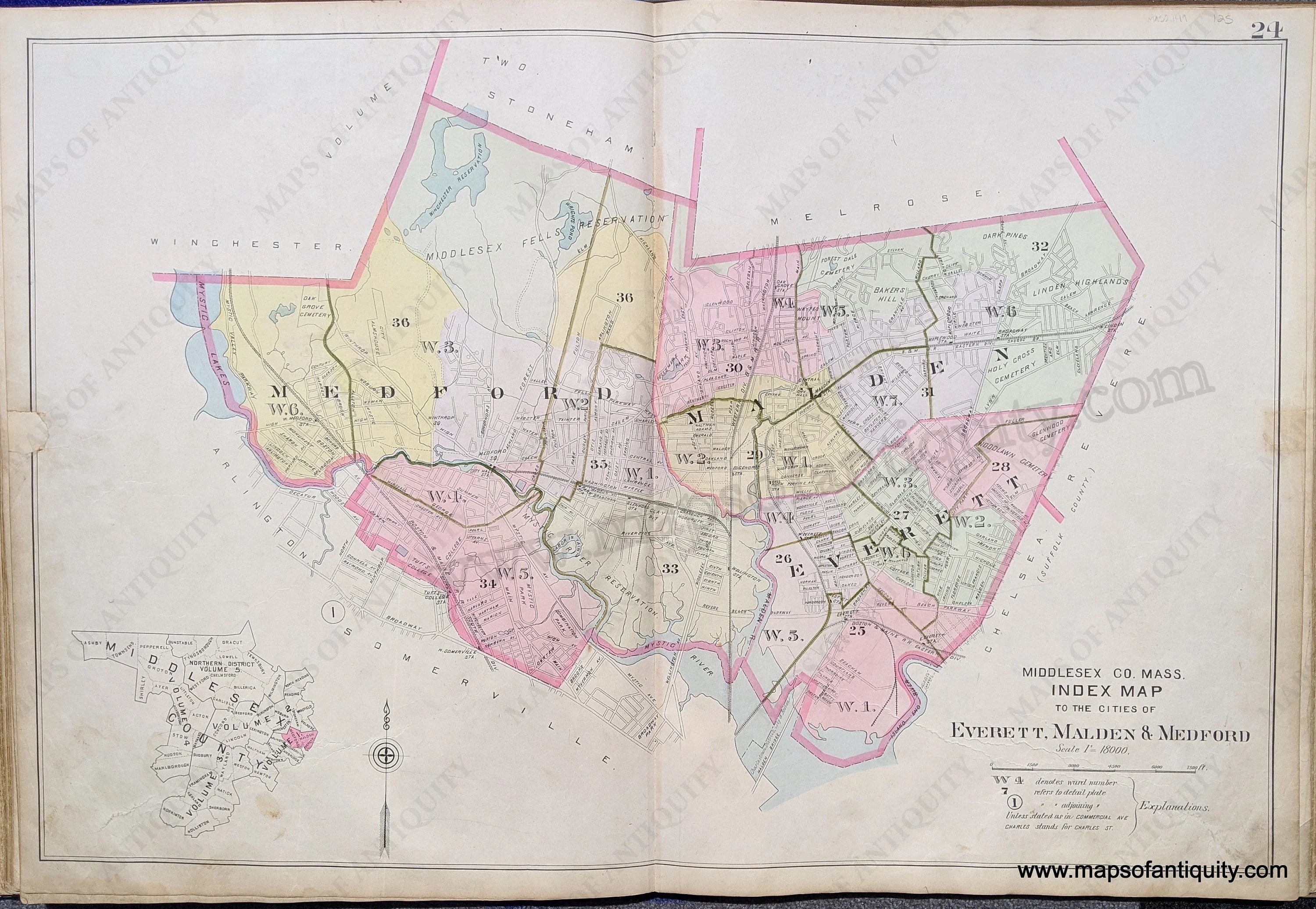 Antique map of Medford, Malden, and Everett, MA, from the Atlas of Middlesex County Vol 1, published by Geo. W. Stadley & Co., 1900. This is one of three index maps of the atlas. The town boundaries are shown as pink lines, wards are delineated in green, and the map is colored to indicate the atlas plates. Shows roads, railroads, bodies of water, etc. Fair to good condition with tiny repaired seam separation at bottom, surface soil/stains, wrinkles, and overall toning that is darker at the paper edges. Note the mild damage at bottom corners. Some pencil marks with updates. Should look good when framed- some signs of age will still be visible. Measures approx. 21.5 x 31.5 inches to the paper edges.