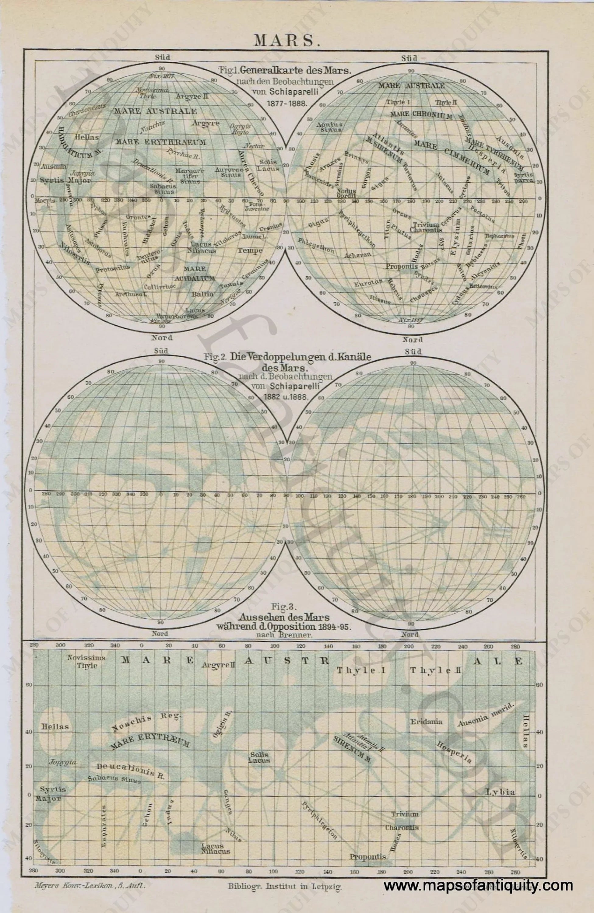 Antique printed color page of maps of Mars, written in German. Includes a general map of Mars according to the observations of Schiaparelli (1877-1888), a map of the “Canals of Mars” based on the observations of Schiaparelli (1882 and 1888), and a map showing the look of Mars during the Opposition to Brenner (1894-95). Very good overall antique condition with mild toning throughout, as well as some minor wrinkling/creasing and roughing of the outer edges of the paper. Map measures approximately 9.5″ x 5.25″ (H x W) to the neatline. **SOLD**