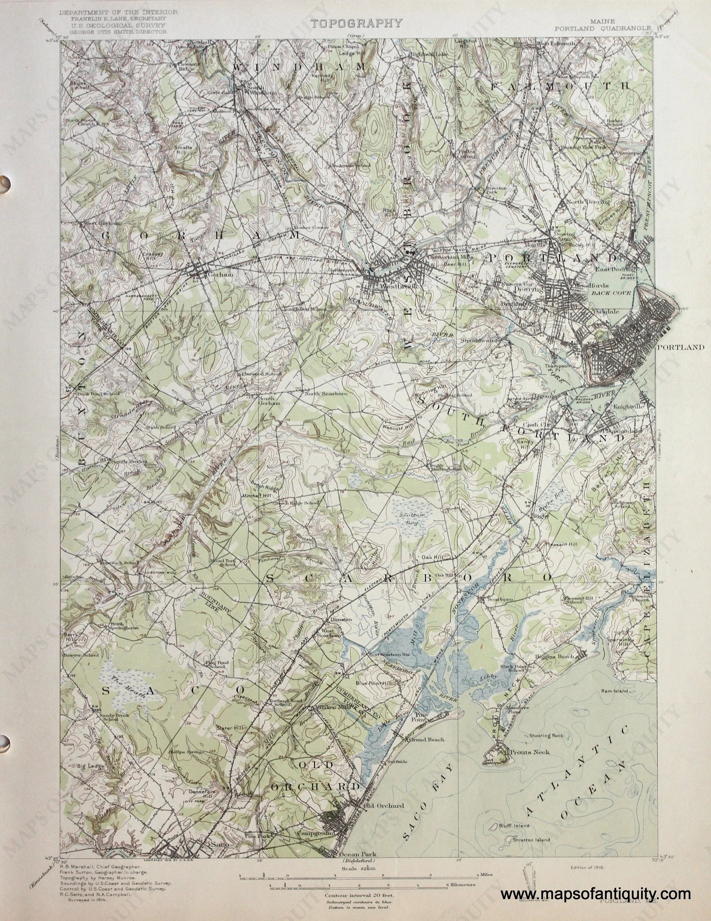 Antique colorized topographical map of Portland, includes Westbrook, Old Orchard, and Gorham. Good condition, toned, approximately 20″ x 15″ to the paper edges.