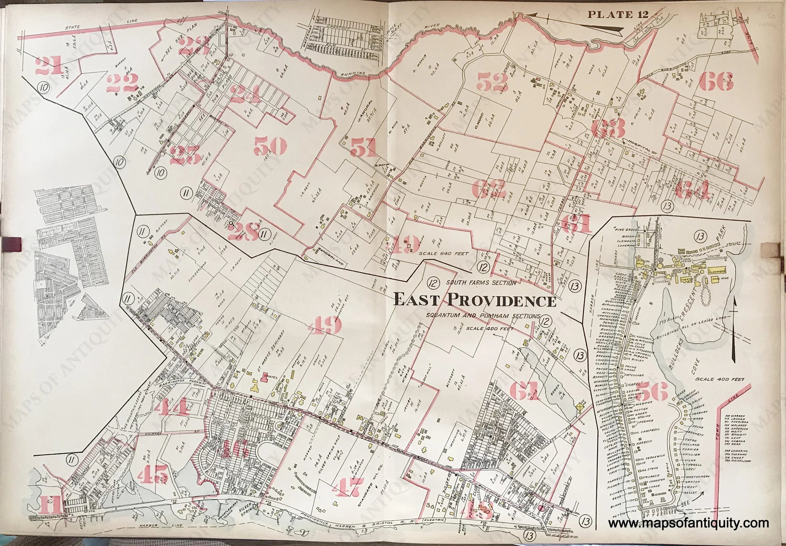Antique map of part of East Providence, RI, Rhode Island, from Richards Standard Atlas of the “Providence Metropolitan District” volume 2, 1917. North is oriented to the left except in the inset. Includes “The Mountain Ledges” park system, St Marys Seminary, Silver Spring Golf Club, Pomham Club, an inset map of Crescent Park (a leisure park featuring a dance hall, theatre, dining hall, and more) with Bullocks Point and Bullocks Cove, and many residences and manufacturing companies. At left there appears to be a later addition, probably stamped onto the page, to update the atlas. These maps were created for tax and insurance purposes and the buildings are coloured by type- the color key was only included on the index, but yellow is wood, red (or pink) is brick, and brown is stone. Large numbers in red designate wards. Overall good antique condition with mild surface soiling at the paper edges, leather tab at left, and a stain at right where the leather tab touches. Paper is toned overall. Some tiny indents in the paper from the page being handled for over 100 years. Measures approx. 22 x 32 inches to the page edges. **SOLD**