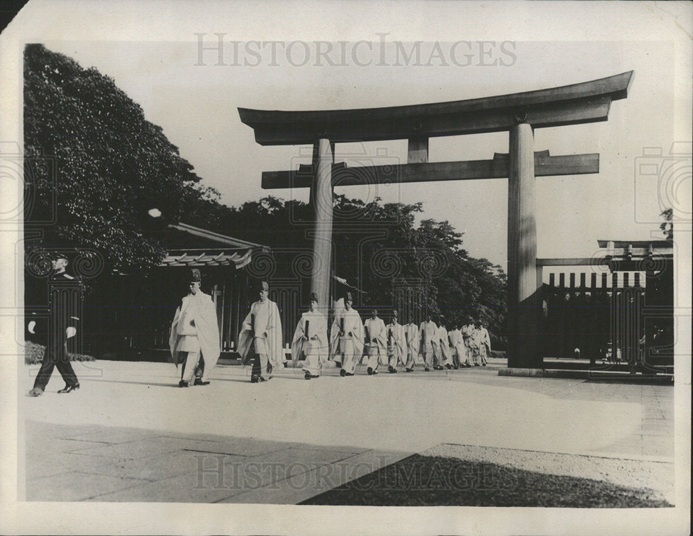 This solemn procession occurred at the great Meiji shrine at Tokyo recently when the Shinto priests solemnized the twentieth anniversary of the death of the great Emperor Meiji, to whose spirit the shrine is dedicated.