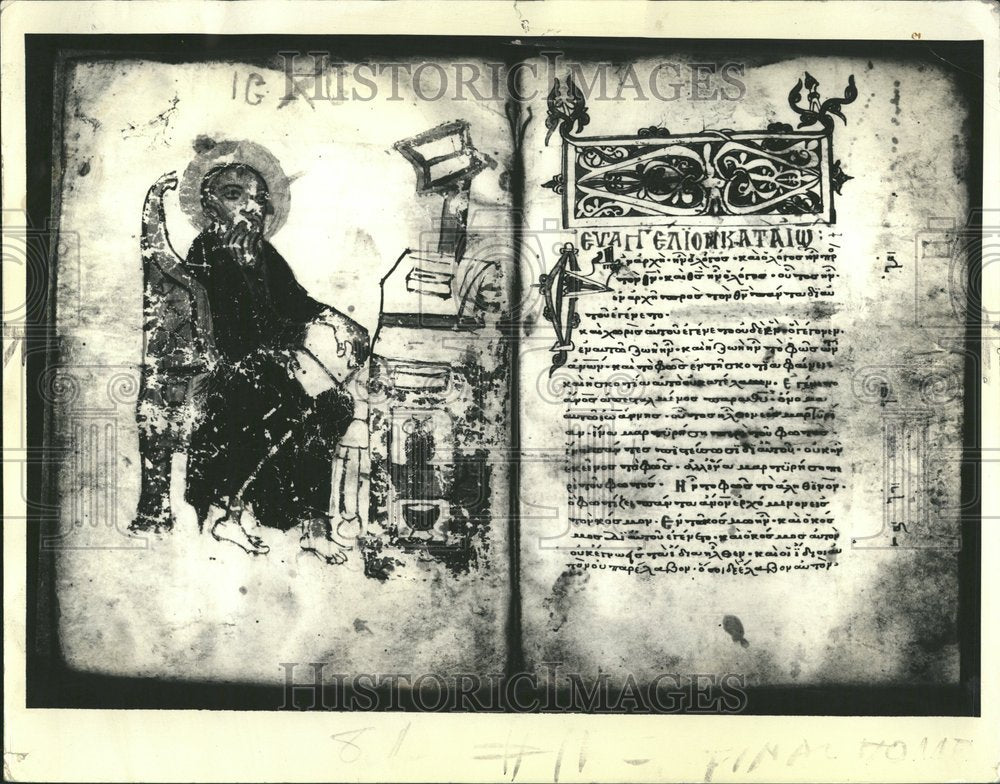 The first two page of an ancient Greek mamiscript of Gospels of Luke and John.