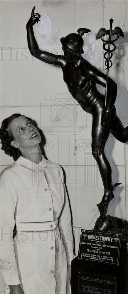 Caption: GOLF TROPHY. Miss Alta Seeburger admires the figure of Mercury, awarded by the late Dr. Arthur D. Holmes for the best golfer in the Wayne County Medical Society. The tournament will be next Wednesday. Photo taken in David Whitney building.