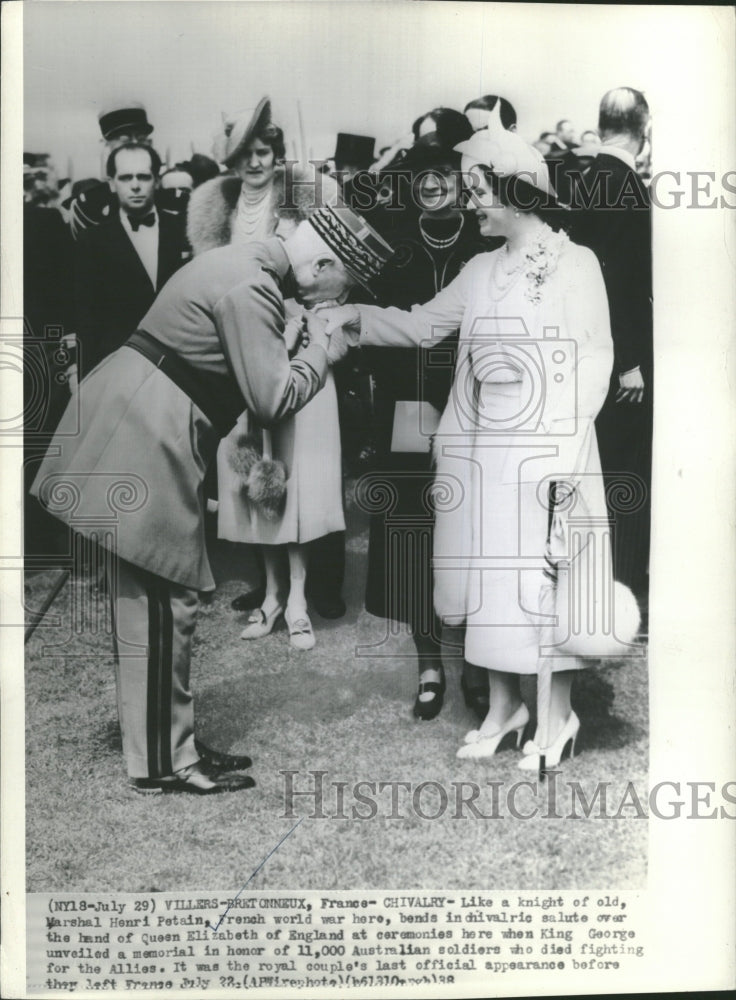 Marshal Henri Petain, French World War, bends over the hand of Queen Elizabeth of England at a memorial in honor of 11,000 soldiers who died fighting the Allies.